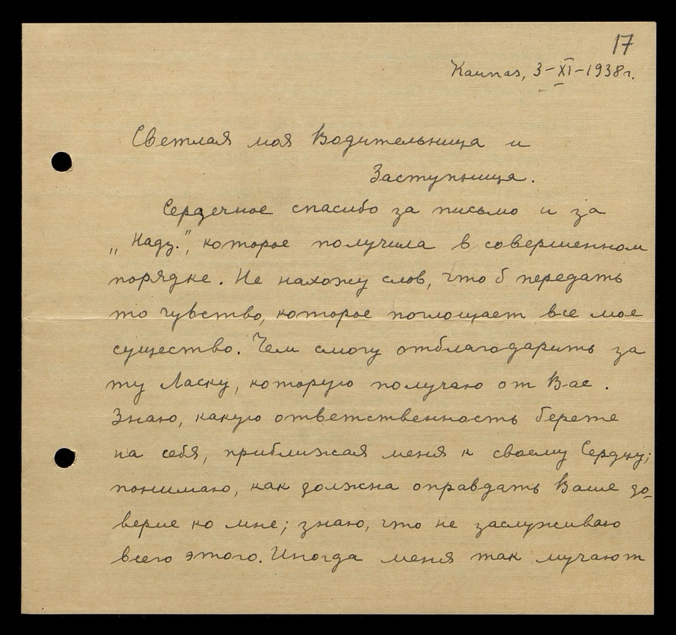 Сердечное спасибо за письмо и за "Надз[емное]", которое получила в совершенном порядке. Не нахожу слов, чтоб передать то чувство, которое поглощает всё моё существо. Чем смогу отблагодарить за ту Ласку, которую получаю от Вас.