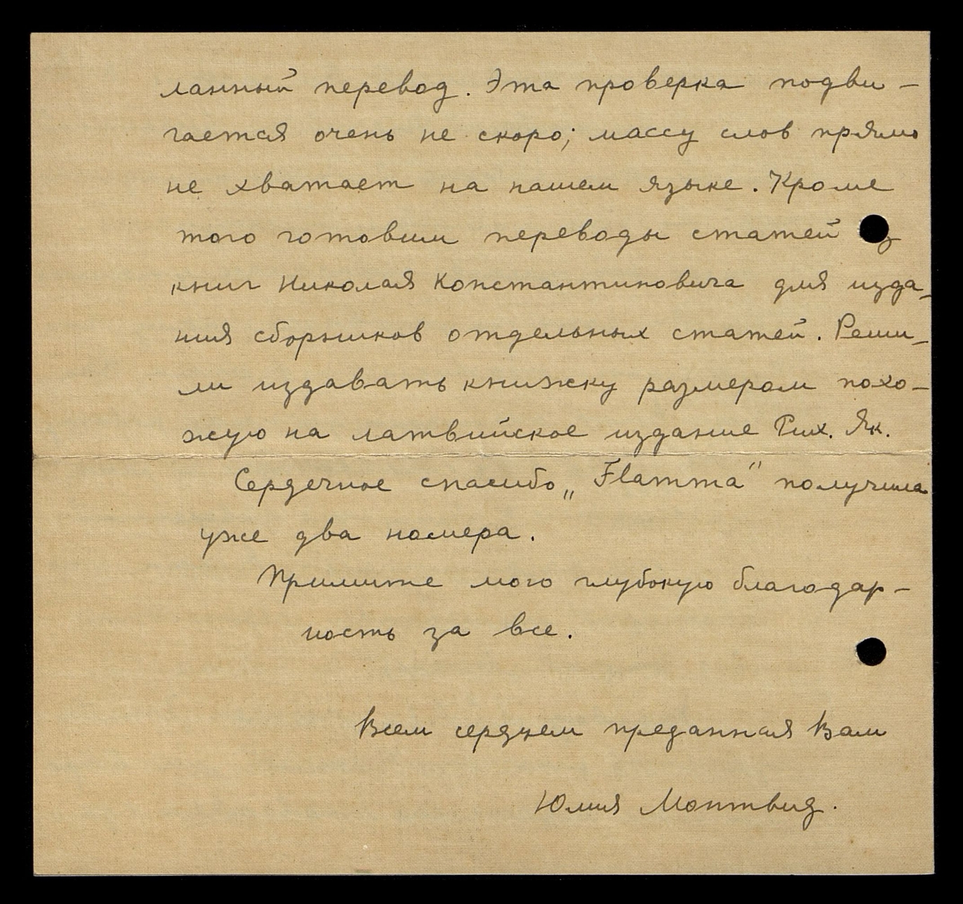 перевод. Эта проверка подвигается очень нескоро; массу слов прямо не хватает на нашем языке. Кроме того готовим переводы статей из книг Николая Константиновича для издания сборников отдельных статей. Решили издавать книжку размером похожую на латвийское издание Рих[арда] Як[овлевича].