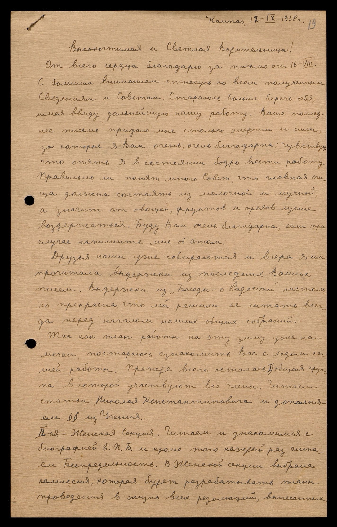 От всего сердца благодарю за письмо от 16-VIII. С большим вниманием отнесусь ко всем полученным Сведениям и Советам. Стараюсь больше беречь себя, имея в виду дальнейшую нашу работу. Ваше последнее письмо придало мне столько энергии и силы, за которые я Вам очень, очень благодарна; чувствую, что опять я в состоянии бодро вести работу. Правильно ли понят мною Совет, что главная пища должна состоять из молочной и мучной, а значит от овощей, фруктов и орехов лучше воздержаться. Буду Вам очень, очень благодарна, если при случае напишите мне об этом.