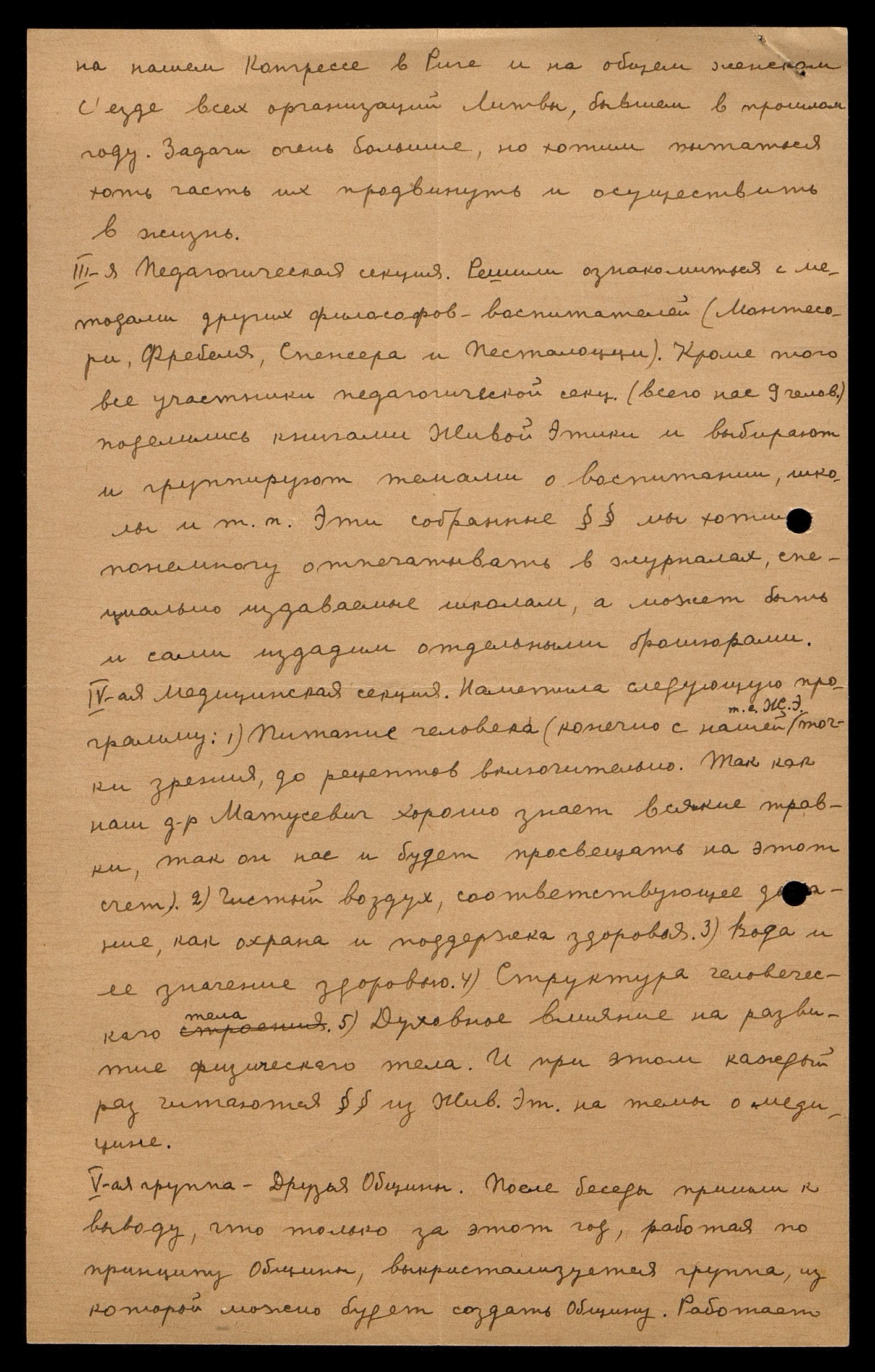 IV-ая — Медицинская секция. Наметила следующую программу: 1) Питание человека (конечно, с нашей, т.е. Ж[ивой] Э[тики] точки зрения, до рецептов включительно. Так как наш д-р Матусевич хорошо знает всякие травки, так он нас и будет просвещать на этот счёт). 2) Чистый воздух, соответствующее дыхание — как охрана и поддержка здоровью. 4) Структура человеческого тела. 5) Духовное влияние на развитие физического тела. И при этом каждый раз читаются §§ из Жив[ой] Эт[ики] на темы о медицине.