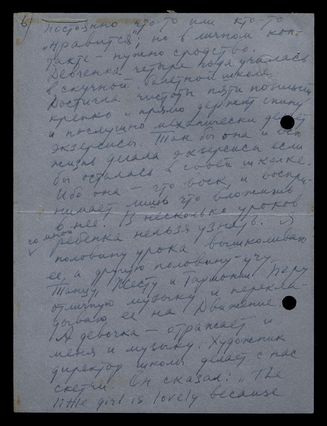 постоянно что–то или кто–то «нравится»; но в личном контакте — нужно сродство. Девчонка четыре года училась в скучной балетной школе. Достигла чистоты пяти позиций, крепко и прямо держит спину и послушно механически делает экзерсисы. Так бы она и всю жизнь делала экзерсисы, если бы осталась в своей школке. Ибо она — что воск, и воспринимает лишь что вложишь в неё. В несколько уроков со мной ребёнка нельзя узнать. Я половину урока вышколиваю её, а другую половину — учу Танцу, Жесту и Гармонии. Беру отличную музыку и перекладываю её на Движение. А девочка — отражает и меня, и музыку. Художник, директор школы, делает с нас скетчи. Он сказал: "The little girl is lovely because [англ.: Маленькая девочка прелестна, потому что]