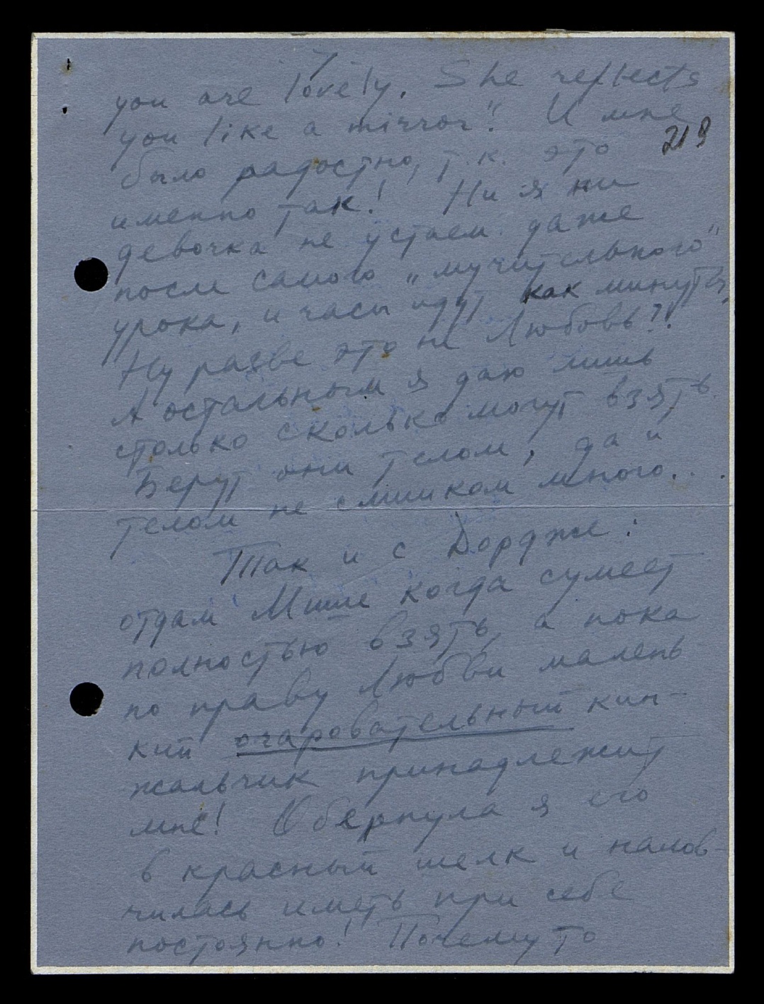 you are lovely. She reflects you like a mirror». [англ.: ты прекрасна. Она отражает тебя, как в зеркале»]. И мне было радостно, так как это именно так! Ни я, ни девочка не устаём даже после самого «мучительного» урока, и часы идут, как минуты. Ну разве это не Любовь?! А остальным я даю лишь столько, сколько могут взять. Берут они телом, да и телом не слишком много…