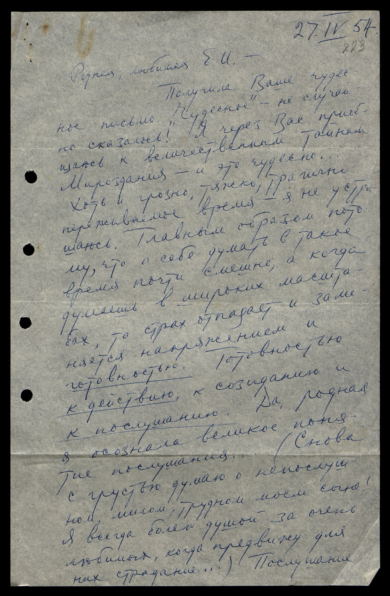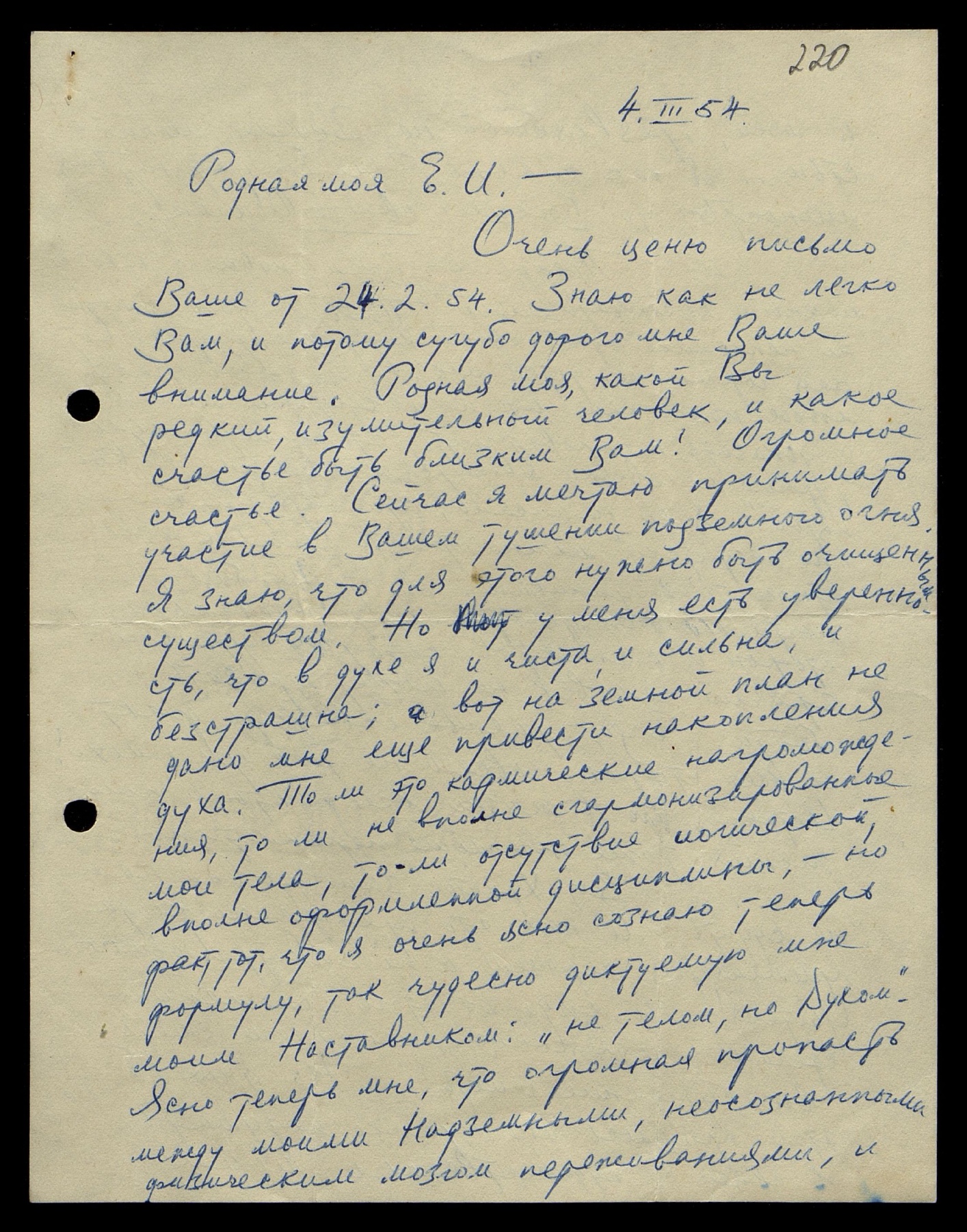 Очень ценю письмо Ваше от 24.02.54. Знаю, как нелегко Вам, и потому сугубо дорого мне Ваше внимание. Родная моя, какой Вы редкий, изумительный человек, и какое счастье быть близким Вам! Огромное счастье. Сейчас я мечтаю принимать участие в Вашем тушении подземного огня. Я знаю, что для этого нужно быть очищенным существом. Но у меня есть уверенность, что в духе я и чиста, и сильна, и бесстрашна; а вот на земной план не дано мне ещё привести накопления духа. То ли это кармические нагромождения, то ли не вполне сгармонизированные мои тела, то ли отсутствие йогической, вполне оформленной дисциплины, — но факт тот, что я очень ясно сознаю теперь формулу, так чудесно диктуемую мне моим Наставником: «Не телом, но Духом». Ясно теперь мне, что огромная пропасть между моими Надземными, неосознанными физическим мозгом переживаниями и