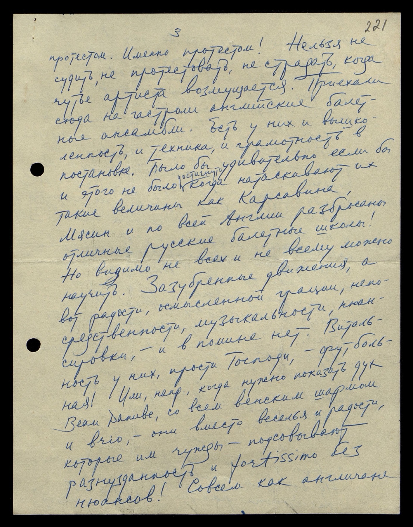 протестом. Именно протестом! Нельзя не судить, не протестовать, не страдать, когда чутьё артиста возмущается. Приехали сюда на гастроли английские балетные ансамбли. Есть у них и вышколенность, и техника, и грамотность в постановке. Было бы удивительно, если бы и этого не было достигнуто, когда натаскивают их такие величины как Карсавина, Мясин и по всей Англии разбросаны отличные русские балетные школы! Но, видимо, не всех и не всему можно научить. Зазубренные движения, а вот радости, музыкальности, нюансировки — и в помине нет. Витальность у них, прости Господи, футбольная! Или, напр[имер], когда нужно показать дух Beau Danube [франц.: Прекрасный Дунай], со всем венским шармом и brio [англ.: живость], они вместо веселья и радости, которые им чужды, подсовывают разнузданность и fortissimo без нюансов! Совсем как англичане
