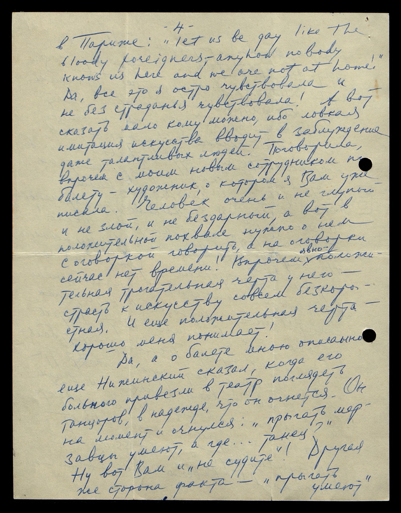 в Париже: «Let us be day like the bloody foreigners — any how nobody knows us here and we are not at home!» [англ.: «Давайте будем такими же, как эти чёртовы иностранцы — все равно нас здесь никто не знает, и мы не у себя дома!»] Да, всё это я остро чувствовала и не без страданья чувствовала! А вот сказать мало кому можно, ибо ловкая имитация искусства вводит в заблуждение даже талантливых людей. Поговорила, впрочем, с моим новым сотрудником по балету — художник, о котором я Вам уже писала. Человек очень и не глупый, и не злой, и не бездарный, а вот в положительной похвале нужно о нём с оговоркой говорить, а на оговорки сейчас нет времени! Впрочем, явно положительная трогательная черта у него — страсть к искусству совсем бескорыстная. И ещё положительная черта — хорошо меня понимает!