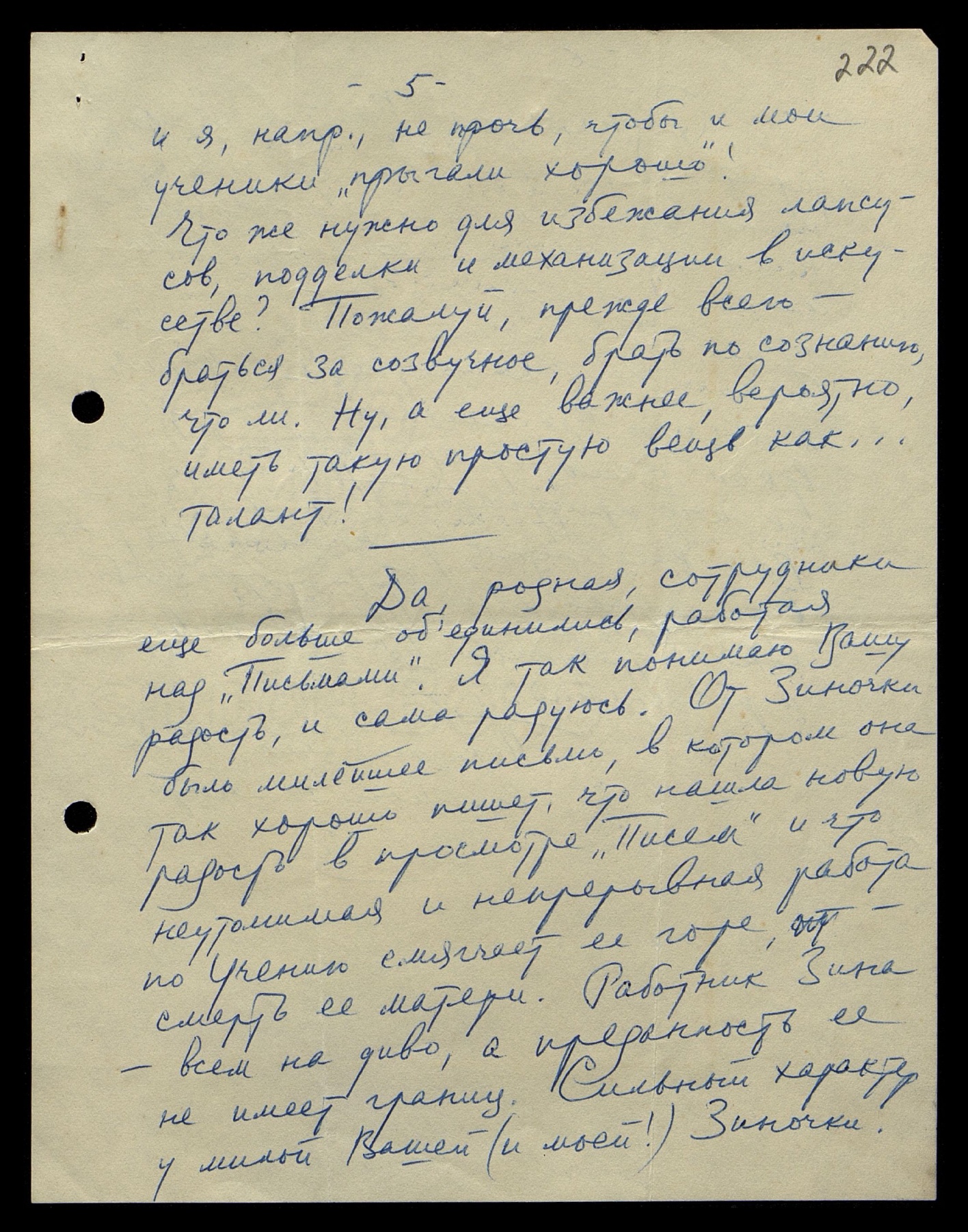 Да, родная, сотрудники ещё больше объединились, работая над «Письмами». Я так понимаю Вашу радость, и сама радуюсь. От Зиночки было милейшее письмо, в котором она так хорошо пишет, что нашла новую радость в просмотре «Писем» и что неутомимая и непрерывная работа по Учению смягчает её горе, смерть её матери. Работник Зина — всем на диво, а преданность её не имеет границ. Сильный характер у милой Вашей (и моей!) Зиночки.