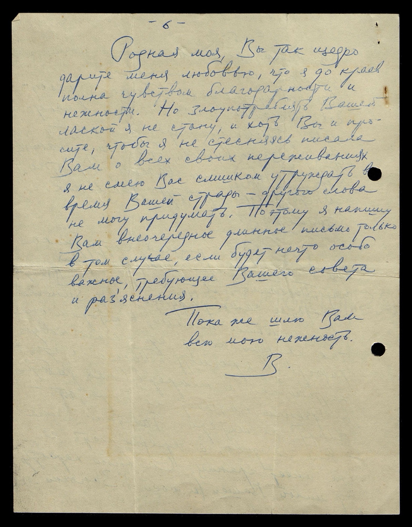 Родная моя, Вы так щедро дарите меня любовью, что я до краёв полна чувством благодарности и нежности. Но злоупотреблять Вашей лаской я не стану, и хоть Вы и просите, чтобы я не стесняясь писала Вам о всех своих переживаниях, я не смею Вас слишком утруждать во время Вашей страды — другого слова не могу придумать. Поэтому я напишу Вам внеочередное длинное письмо только в том случае, если будет нечто особо важное, требующее Вашего совета и разъяснения.