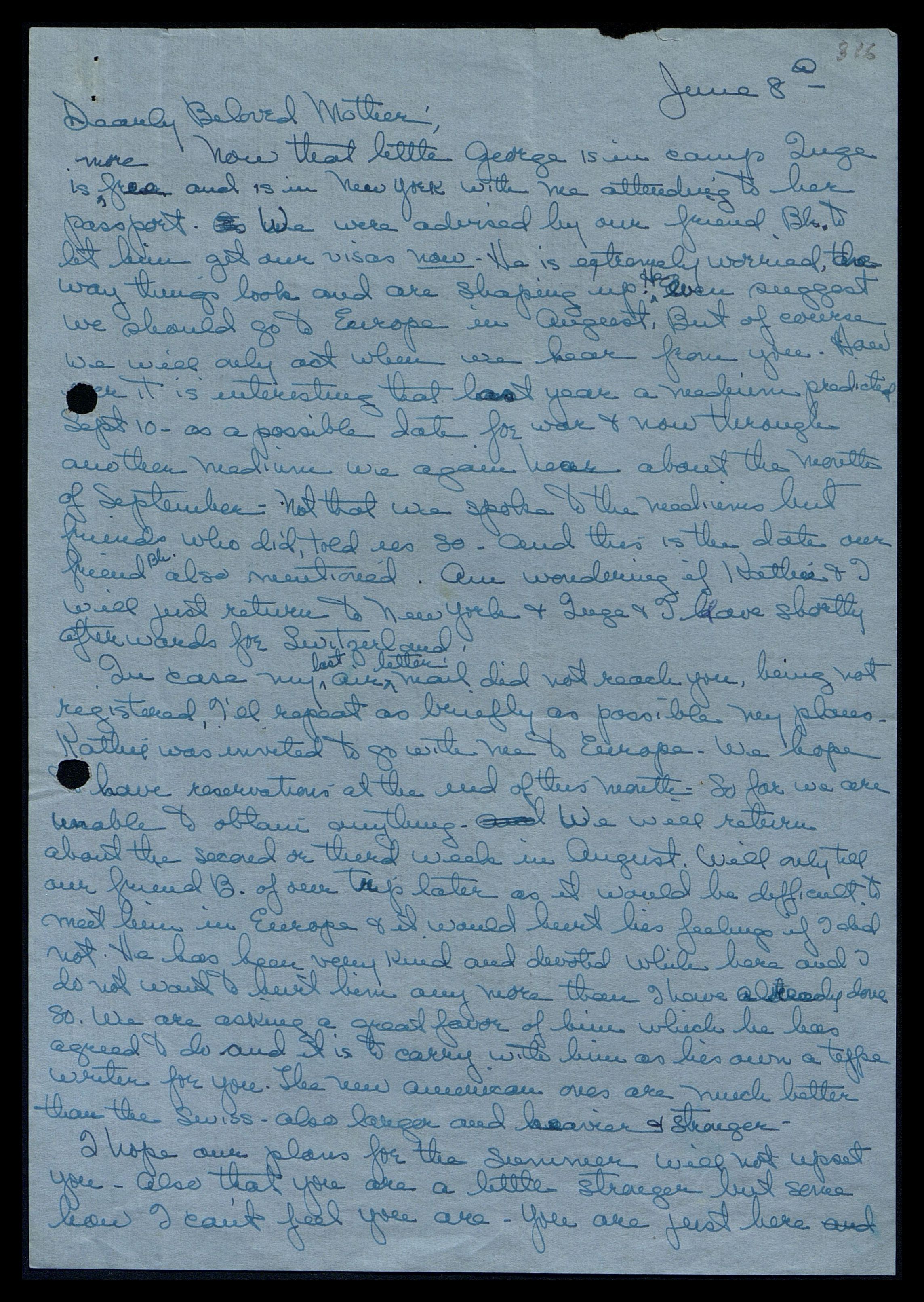 Mother dearest, when you are feeling better, will you try to let me know if you think I should try to see if I can somehow arrange to stay longer in Europe or return as now planned in August? Also, if a conflict is coming this fall, then should Aida [Princes]not try to get work in Connecticut [USA] and not remain in New York? There is no need to answer right away, as Inge can always forward any mail from you to me in Europe.