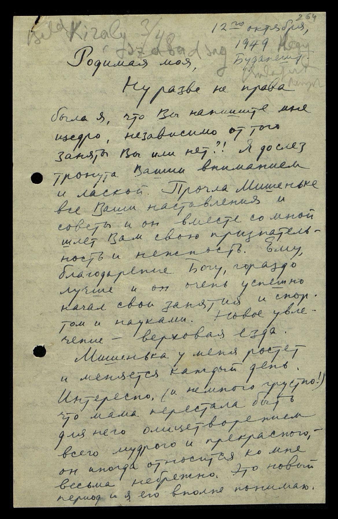 Родимая моя, ну разве не права была я, что Вы напишите мне щедро, независимо от того заняты ли Вы или нет?! Я до слез тронута Вашим вниманием и лаской. Прочла Мишеньке все Ваши наставления и советы, и он вместе со мной шлёт Вам свою признательность и нежность. Ему, благодарение Богу, гораздо лучше, и он очень успешно начал свои занятия и спортом, и науками. Новое увлечение — верховая езда.