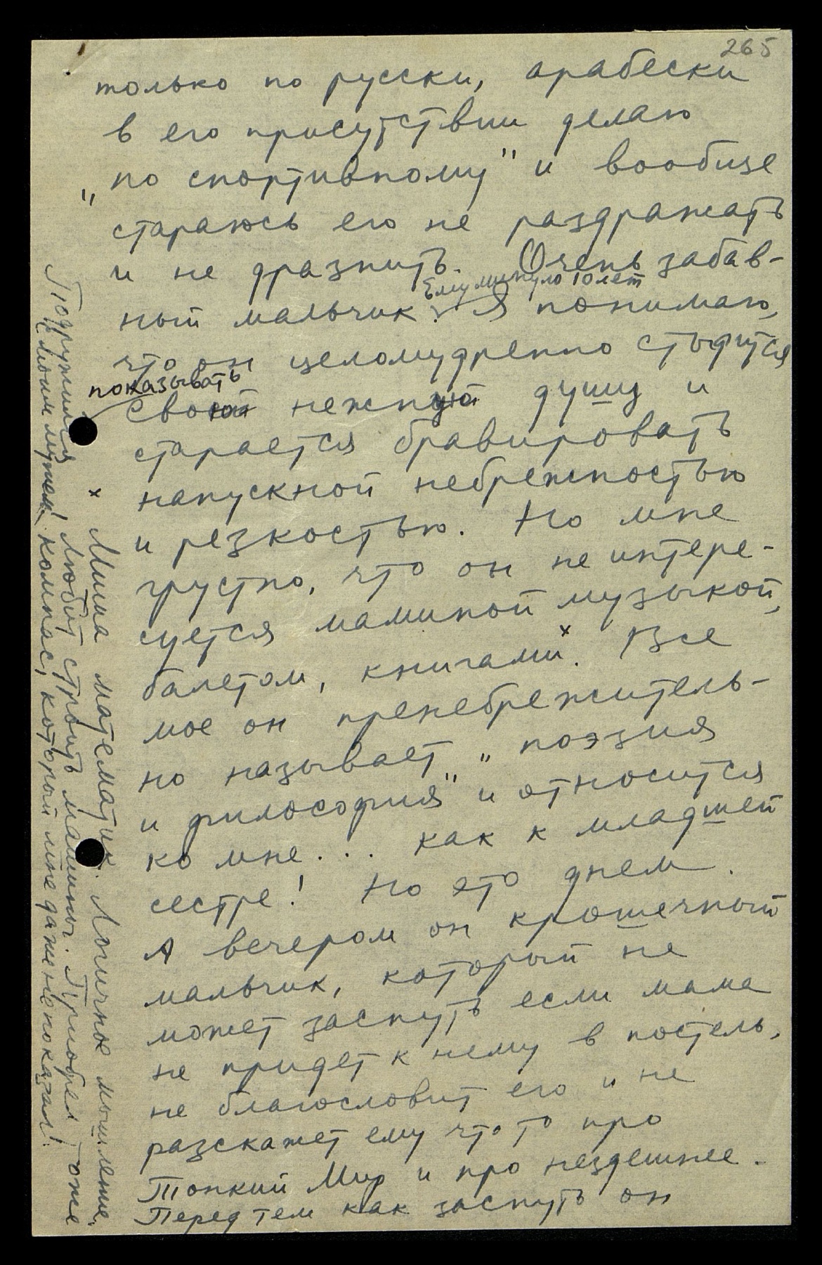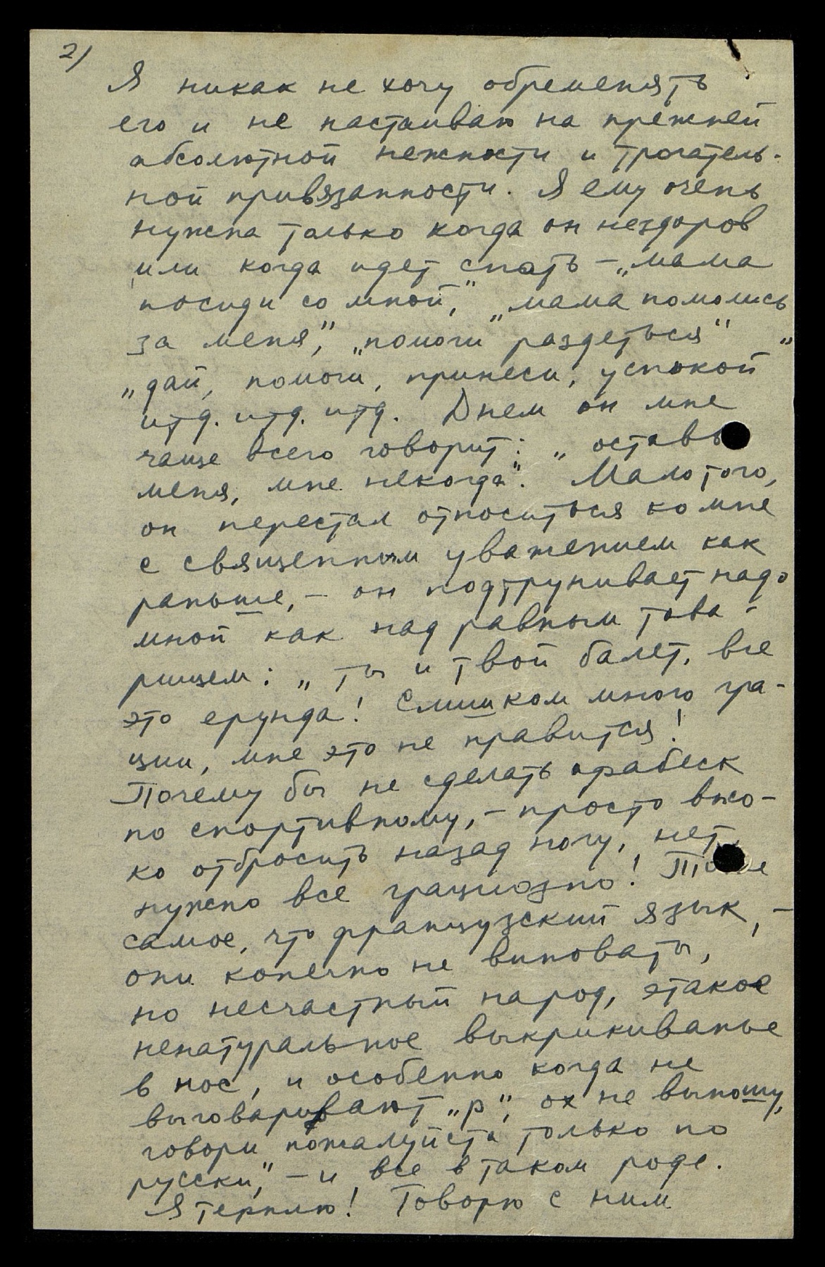 Я никак не хочу обременять его и не настаиваю на прежней абсолютной нежности и трогательной привязанности. Я ему очень нужна, только когда он нездоров или когда идёт спать — "мама, посиди со мной", "мама, помолись за меня", "помоги раздеться", "дай, помоги, принеси, успокой" и т.д., и т.д. и т.д. Днём он мне чаще всего говорит: "Оставь меня, мне некогда". Мало того, он перестал относиться ко мне со священным уважением, как раньше, он подтрунивает надо мной, как над равным товарищем: "Ты и твой балет — всё это ерунда! Слишком много грации, мне это не нравится! Почему бы не сделать арабеск по-спортивному — просто высоко отбросить назад ногу, нет, нужно всё грациозно! То же самое, что французский язык, — они, конечно, не виноваты, но несчастный народ, этакое ненатуральное выкрикивание в нос, и особенно, когда не выговаривают "р"; ох, не выношу, говори, пожалуйста, только по-русски", — и всё в таком роде. Я терплю! Говорю с ним