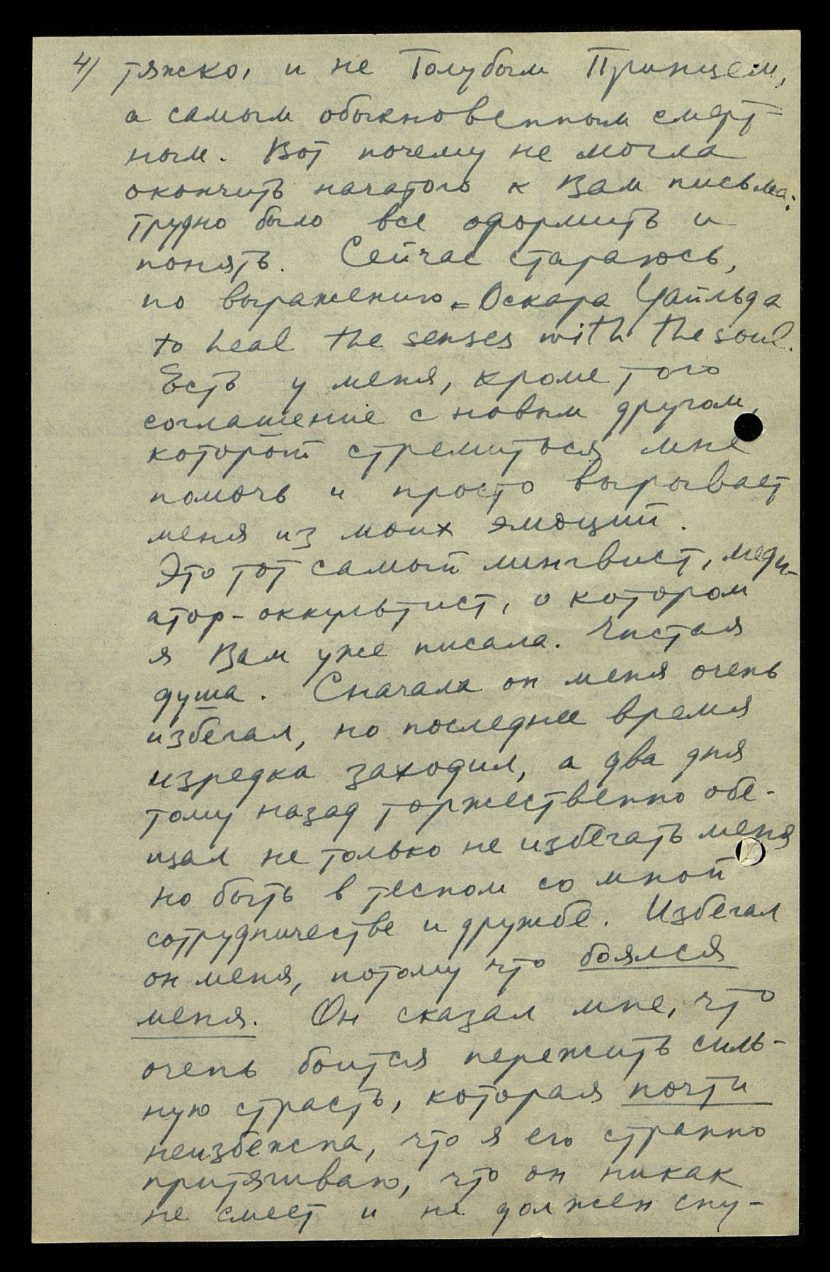 тяжко, и не Голубым Принцем, а самым обыкновенным смертным. Вот почему не могла окончить начатого к Вам письма, трудно было всё оформить и понять. Сейчас стараюсь по выражению Оскара Уайльда to heal the senses with the soul [англ.: излечивать чувства душою]. Есть у меня, кроме того, соглашение с новым другом, который стремится мне помочь и просто вырывает меня из моих эмоций. Это тот самый лингвист, медиатор-оккультист, о котором я Вам уже писала. Чистая душа. Сначала он меня очень избегал, но последнее время изредка заходил, а два дня тому назад торжественно обещал не только не избегать меня, но быть в тесном со мной сотрудничестве и дружбе. Избегал он меня, потому что боялся меня. Он сказал мне, что очень боится пережить сильную страсть, которая почти неизбежна, что я его странно притягиваю, что он никак не смеет и не должен спу-