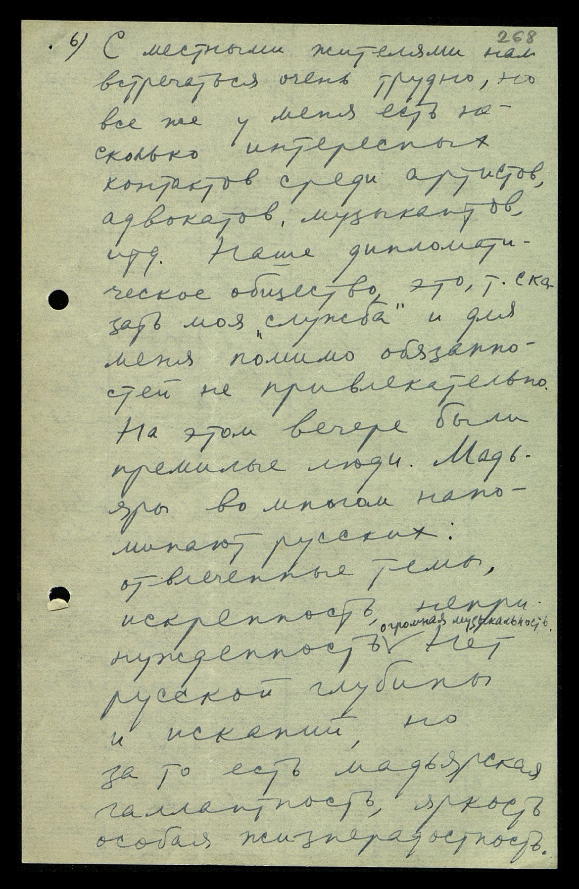С местными жителями нам встречаться очень трудно, но всё же у меня есть несколько интересных контактов среди артистов, адвокатов, музыкантов и т[ак] д[алее]. Наше дипломатическое общество — это, так сказать, моя "служба", и для меня, помимо обязанностей, не привлекательно. На этом вечере были премилые люди. Мадьяры во многом напоминают русских: отвлечённые темы, искренность, непринужденность, огромная музыкальность. Нет русской глубины и исканий, но зато есть мадьярская галантность, яркость, особая жизнерадостность.