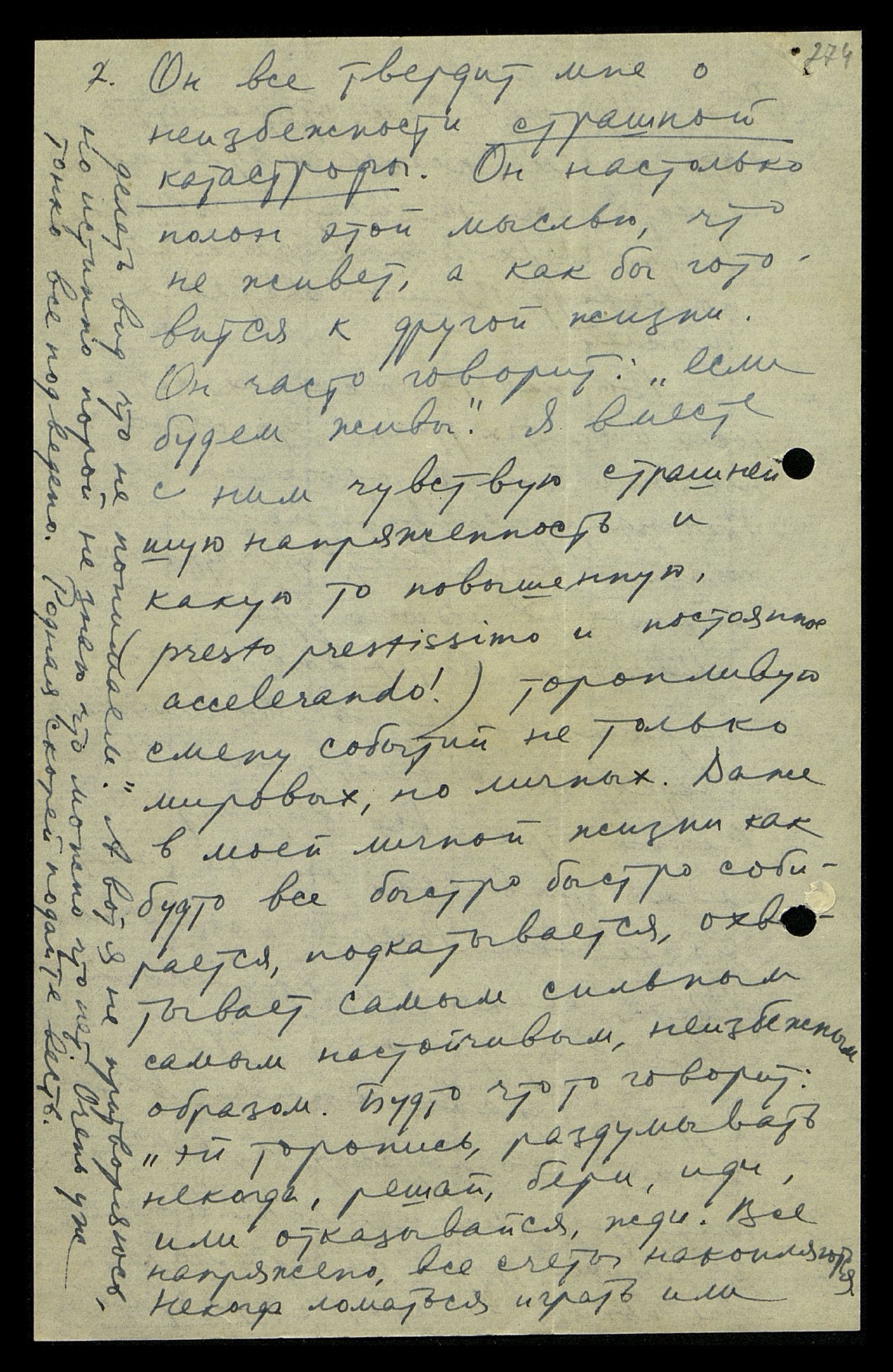 Он всё твердит мне о неизбежности страшной катастрофы. Он настолько полон этой мыслью, что не живёт, а как бы готовится к другой жизни. Он часто говорит: "Если будем живы". Я вместе с ним чувствую страшнейшую напряжённость и какую-то повышенную (presto prestissimo [итал.: быстро, очень быстро] и постоянное accelerando [итал.: ускоряющийся]!) торопливую смену событий не только мировых, но личных. Даже в моей личной жизни как будто всё быстро, быстро собирается, подкатывается, охватывает самым сильным, самым настойчивым, неизбежным образом. Будто что-то говорит: "Эй, торопись, раздумывать некогда, решай, бери, иди или отказывайся, жди. Все напряжено, все счеты накопляются. Некогда ломаться, играть или делать вид, что не понимаем". А вот я не притворяюсь, но, истинно, порой не знаю, что можно, что нет. Очень уж тонко всё подведено. Родная, скорей подайте весть.