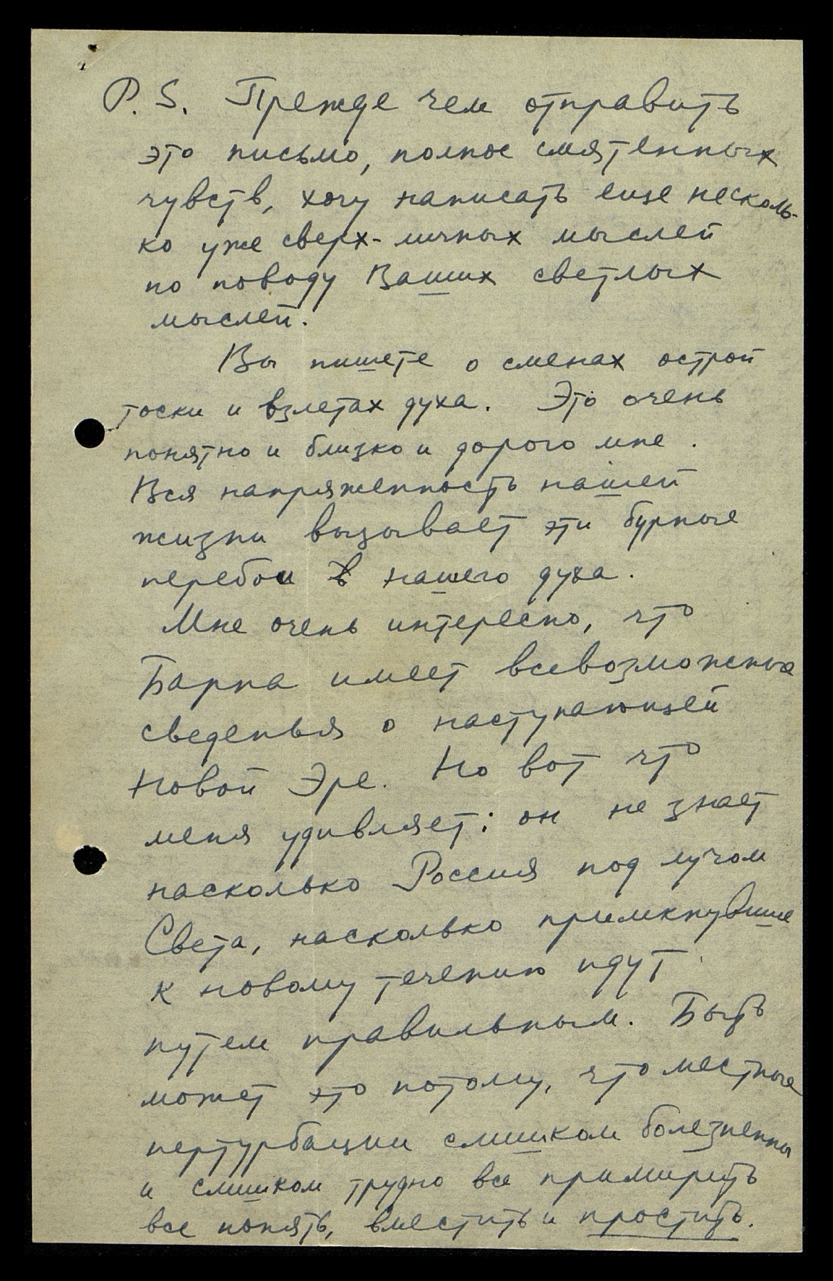 P.S. Прежде, чем отправить это письмо, полное смятенных чувств, хочу написать ещё несколько уже сверхличных мыслей по поводу Ваших светлых мыслей. Вы пишите о сменах острой тоски и взлёта духа. Это очень понятно и близко, и дорого мне. Вся напряжённость нашей жизни вызывает эти бурные перебои нашего духа. Мне очень интересно, что Барна имеет всевозможные сведенья о наступающей Новой Эре. Но вот, что меня удивляет: он не знает, насколько Россия под лучом Света, насколько примкнувшие к новому течению идут путём правильным. Быть может, это потому, что местные пертурбации слишком болезненны и слишком трудно всё примирить, всё понять, вместить и простить.
