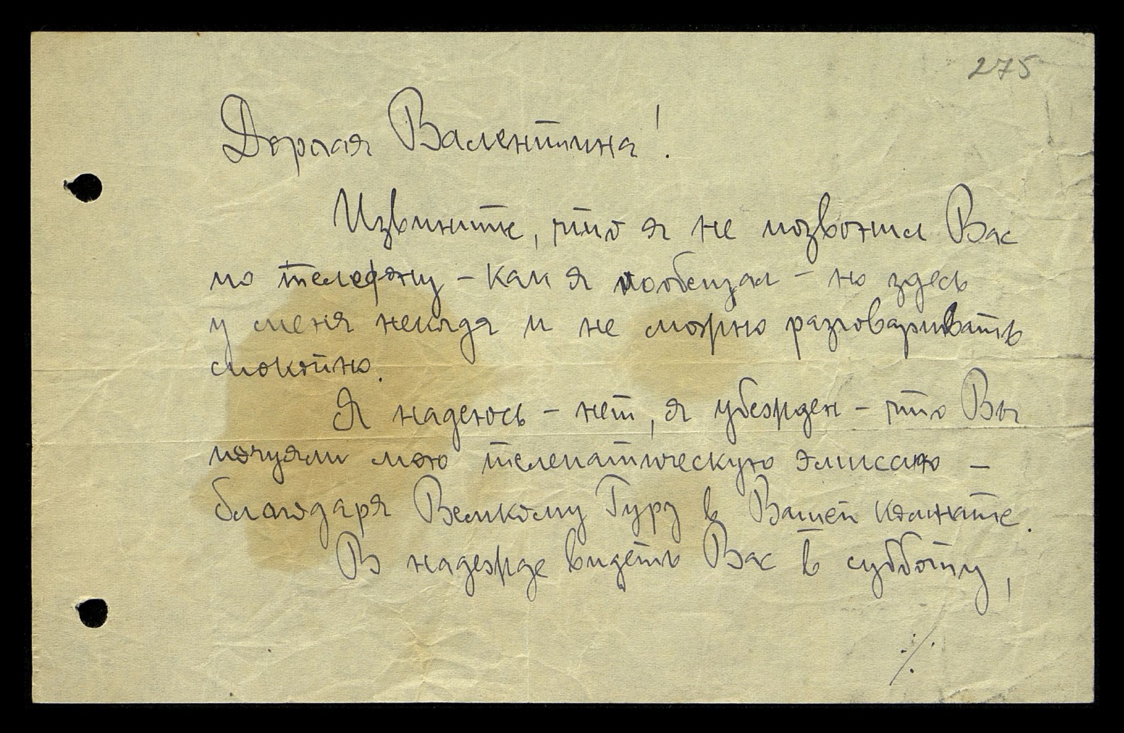 Дорогая Валентина! Извините, что я не позвонил Вас по телефону, как я пообещал, но здесь у меня некогда и не можно разговаривать спокойно.