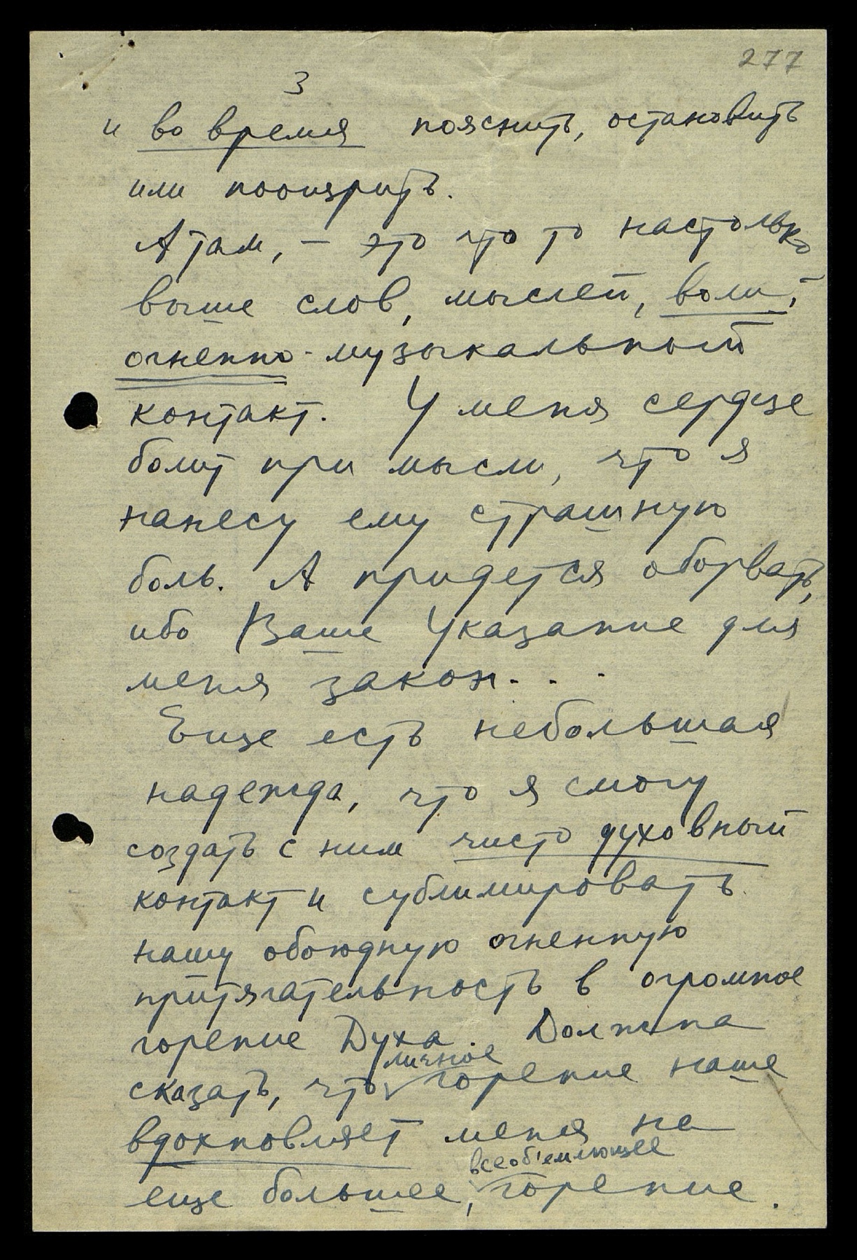 А там, — это что-то настолько выше слов, мыслей, воли — огненно-музыкальный контакт. У меня сердце болит при мысли, что я нанесу ему страшную боль. А придётся оборвать, ибо Ваше Указание для меня — закон... Ещё есть небольшая надежда, что я смогу создать с ним чисто духовный контакт и сублимировать нашу обоюдную огненную притягательность в огромное горение Духа. Должна сказать, что личное горение наше вдохновляет меня на ещё большее, всеобъемлющее горение.