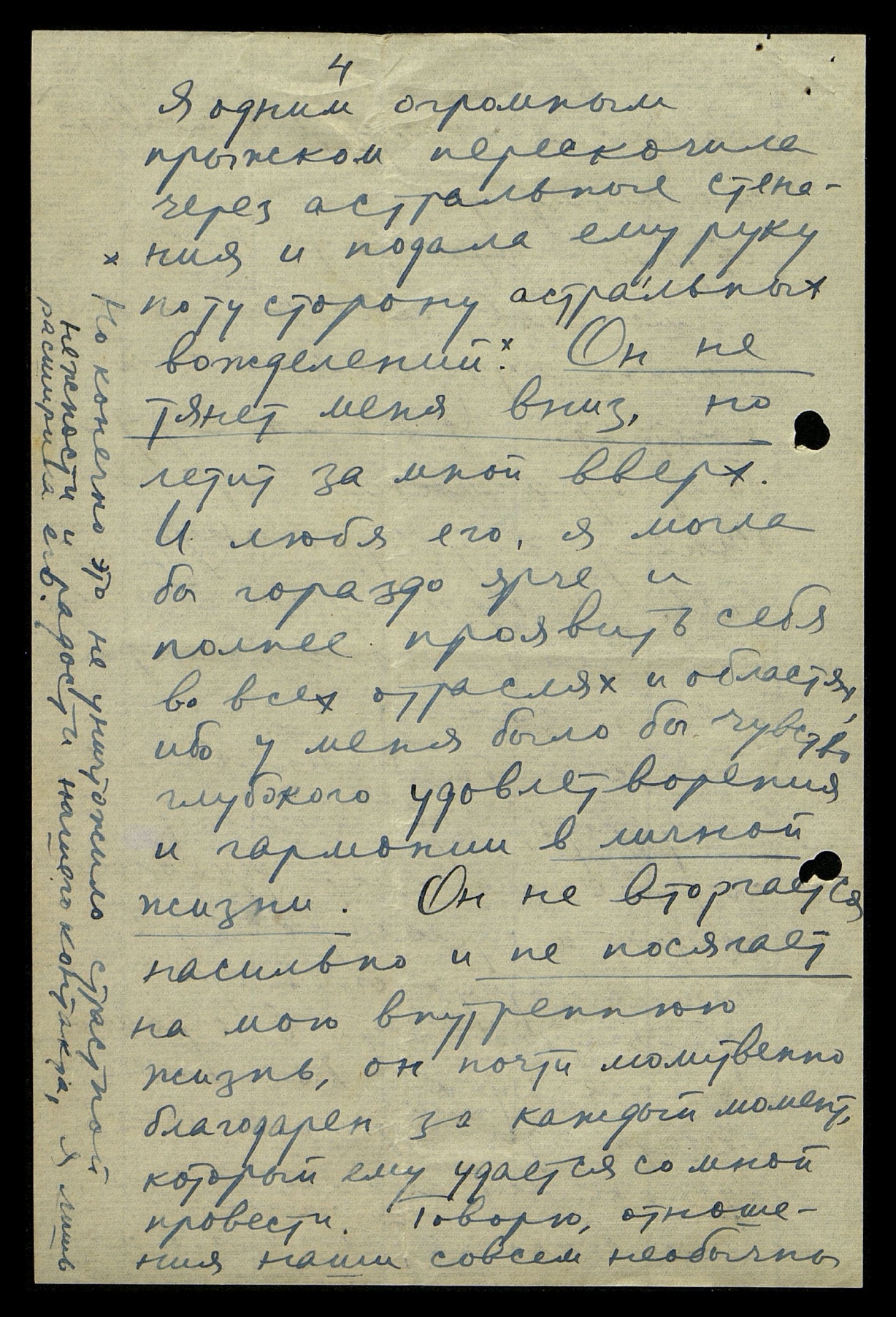 Я одним огромным прыжком перескочила через астральные стенания и подала ему руку по ту сторону астральных вожделений.* Он не тянет меня вниз, но летит за мной вверх. И любя его, я могла бы гораздо ярче и полнее проявить себя во всех отраслях и областях, ибо у меня было бы чувство глубокого удовлетворения и гармонии в личной жизни. Он не восторгается насильно и не посягает на мою внутреннюю жизнь, он почти молитвенно благодарен за каждый момент, который ему удаётся со мной провести. Говорю, отношения наши совсем необычны,