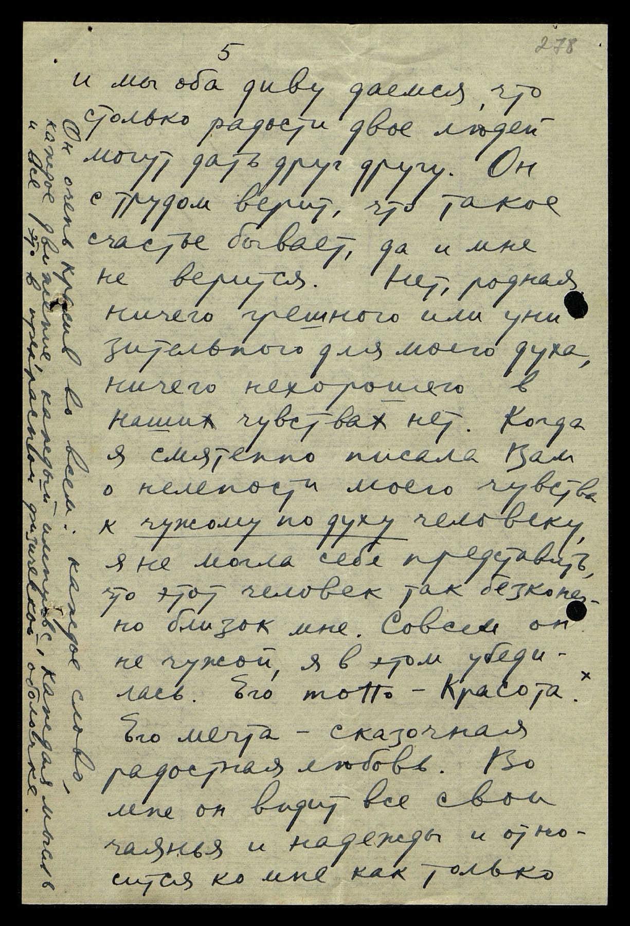 Трудно обо всём рассказать. Попытаюсь коротко и ясно обо всём подумать и написать. Мой новый друг не только привлечён и страстно влюблён, но он сосредоточил на мне весь пыл своего сердца и духа, он живёт мной, болеет обо мне, рвётся ко мне. Он мне дорог, мил и близок до странности.