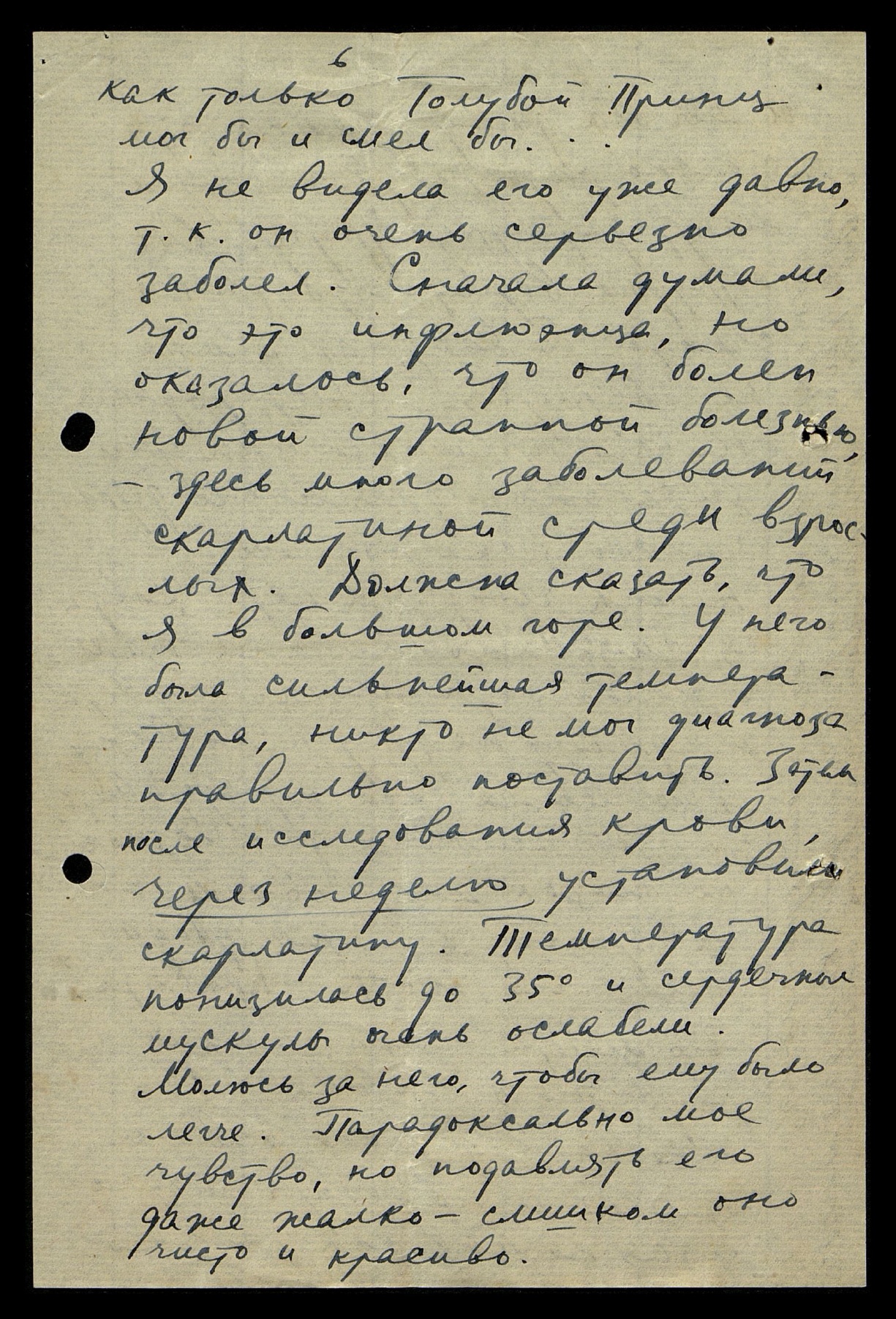 Я не видела его уже давно, так как он очень серьёзно заболел. Сначала думали, что это инфлюэнца, но оказалось, что он болен новой странной болезнью, здесь много заболеваний скарлатиной среди взрослых. Должна сказать, что я в большом горе. У него была сильнейшая температура, никто не мог диагноза правильно поставить. Затем после исследования крови, через неделю установили скарлатину. Температура понизилась до 35°, и сердечные мускулы очень ослабели. Молюсь за него, чтобы ему было легче. Парадоксально моё чувство, но подавлять его даже жалко — слишком оно чисто и красиво.