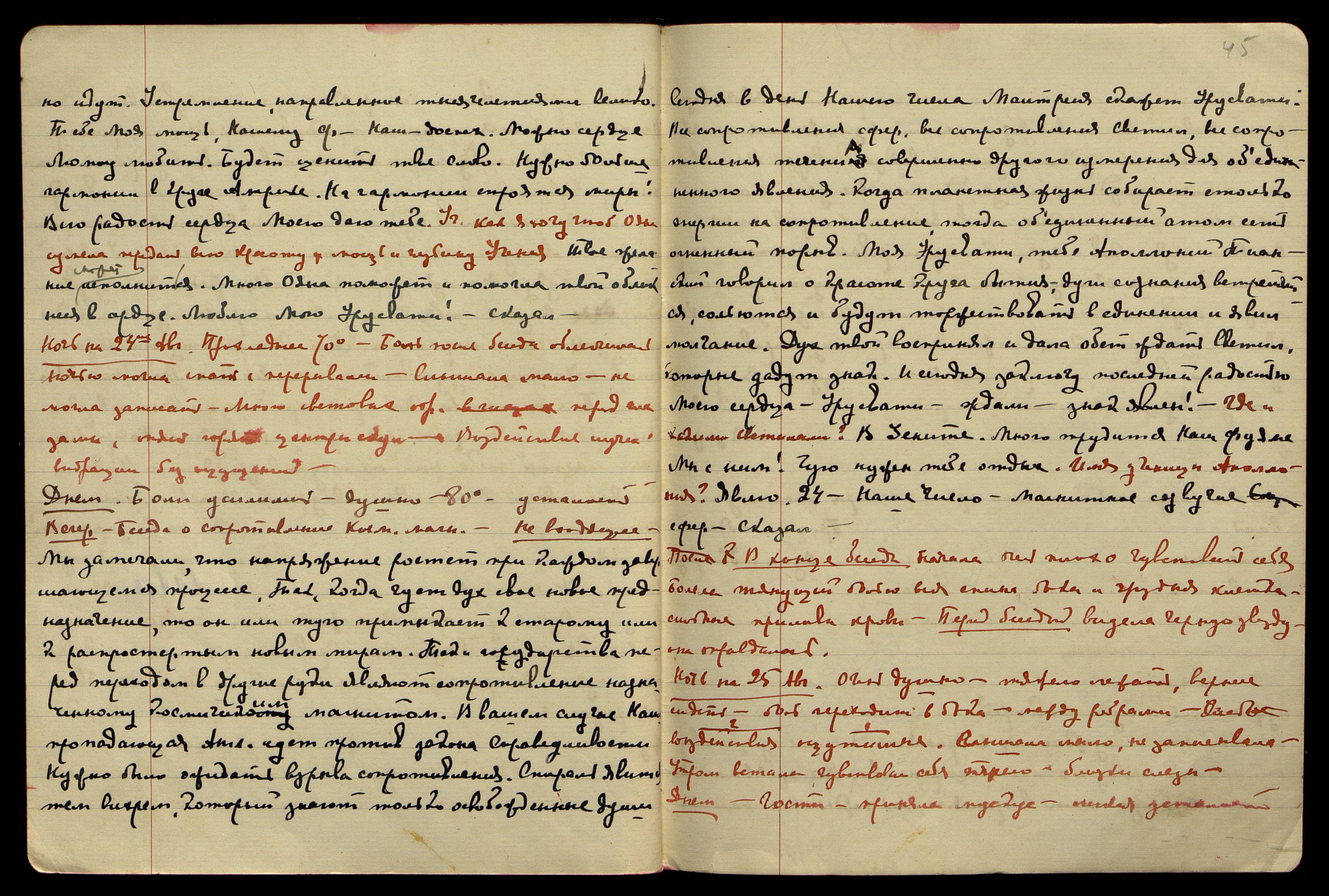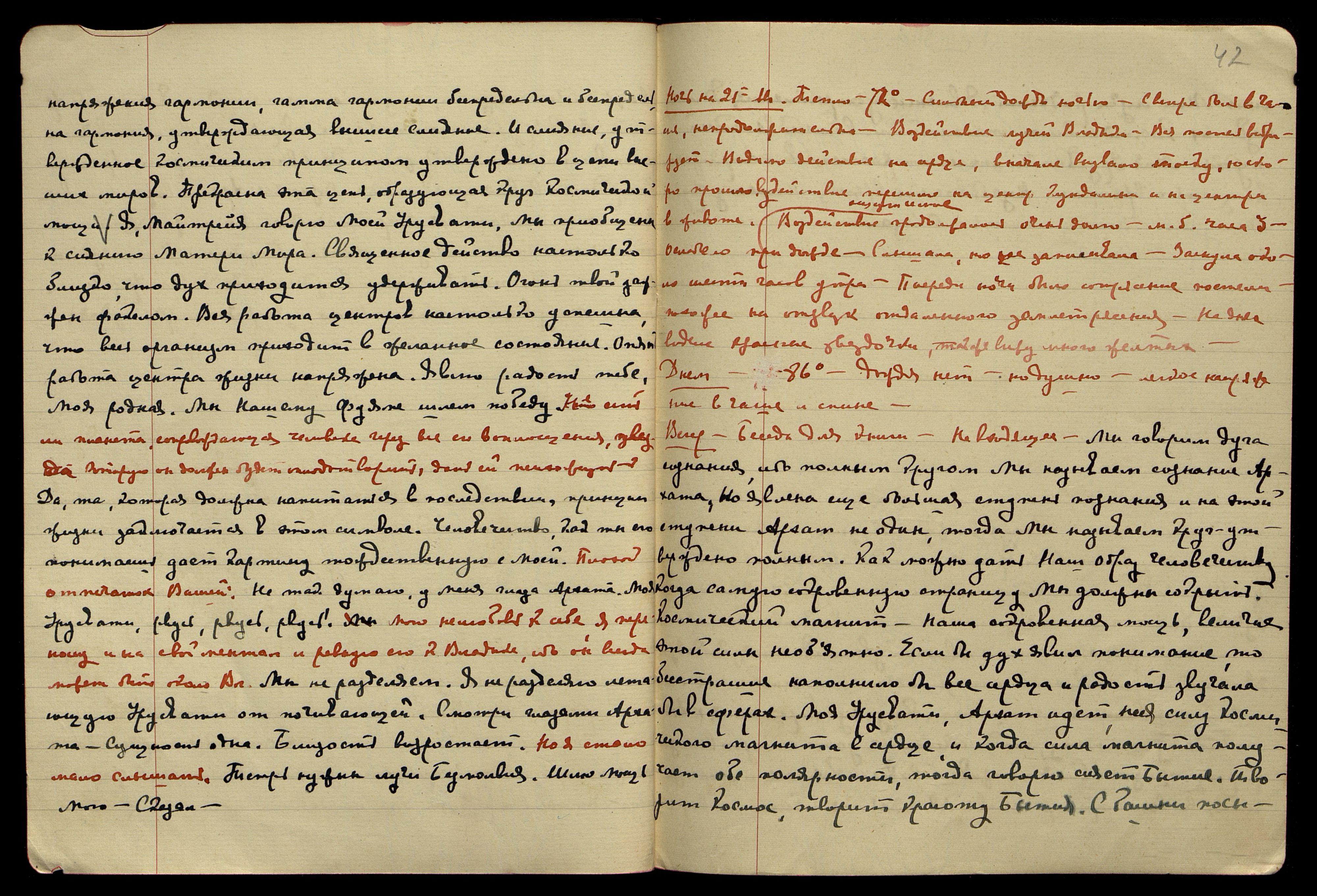Ночь на 24-е августа. Прохладнее. 70°. Боль после беседы облегчилась. Ночью могла спать с перерывами. Слышала мало, не могла записать. Много световых обр[азований] перед глазами, опять горят центры скул. Воздействие лучей, вибрации без ощущений.