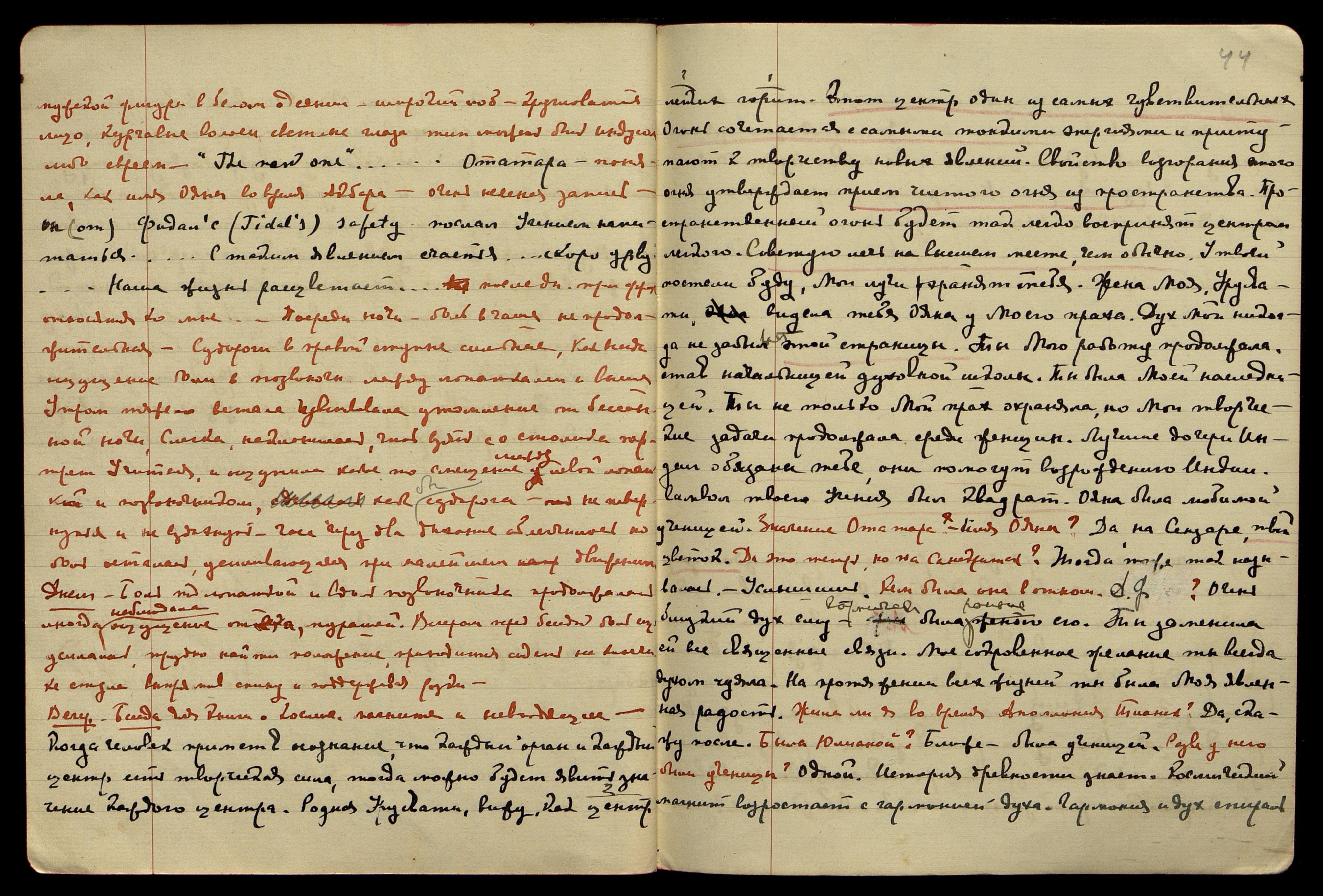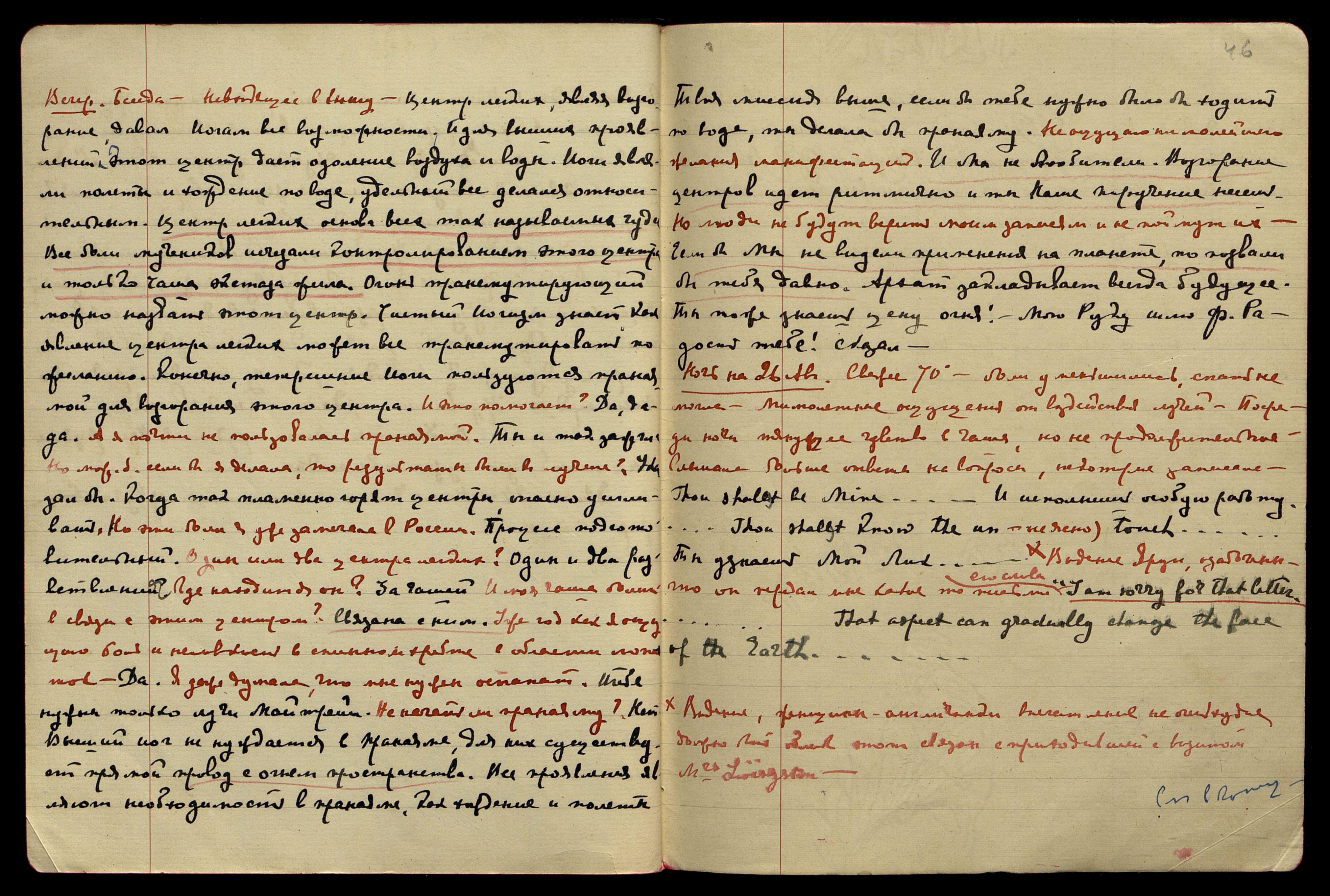 Ночь на 26-е августа. Свежее 70°, боли уменьшились, спать не могла. Мимолётные ощущения от воздействия лучей. Посреди ночи тянущее чувство в Чаше, но непродолжительное. Слышала больше ответы на вопросы, некоторые записала. "Thou shall be Mine [англ.: Ты будешь моей]... И исполнишь особую работу... Thou shall know the un[ited] [англ.: Ты познаешь [единство]], − не ясно, − Touch [англ.: прикасаться]... Ты узнаешь Мой Лик..." Видение, женщины − англичанки, впечатление не очень худое, должно быть, облик этот связан с приходившей с визитом Mrs.[Jionigston]. Видение Яруи, озабоченн[ого], что он передал мне какое-то письмо, его слова: "I am sorry for that letter [англ: Я прошу прощение за это письмо]... that aspect can gradually change the face of the Earth [англ.: этот аспект может постепенно изменить лицо Земли]..."