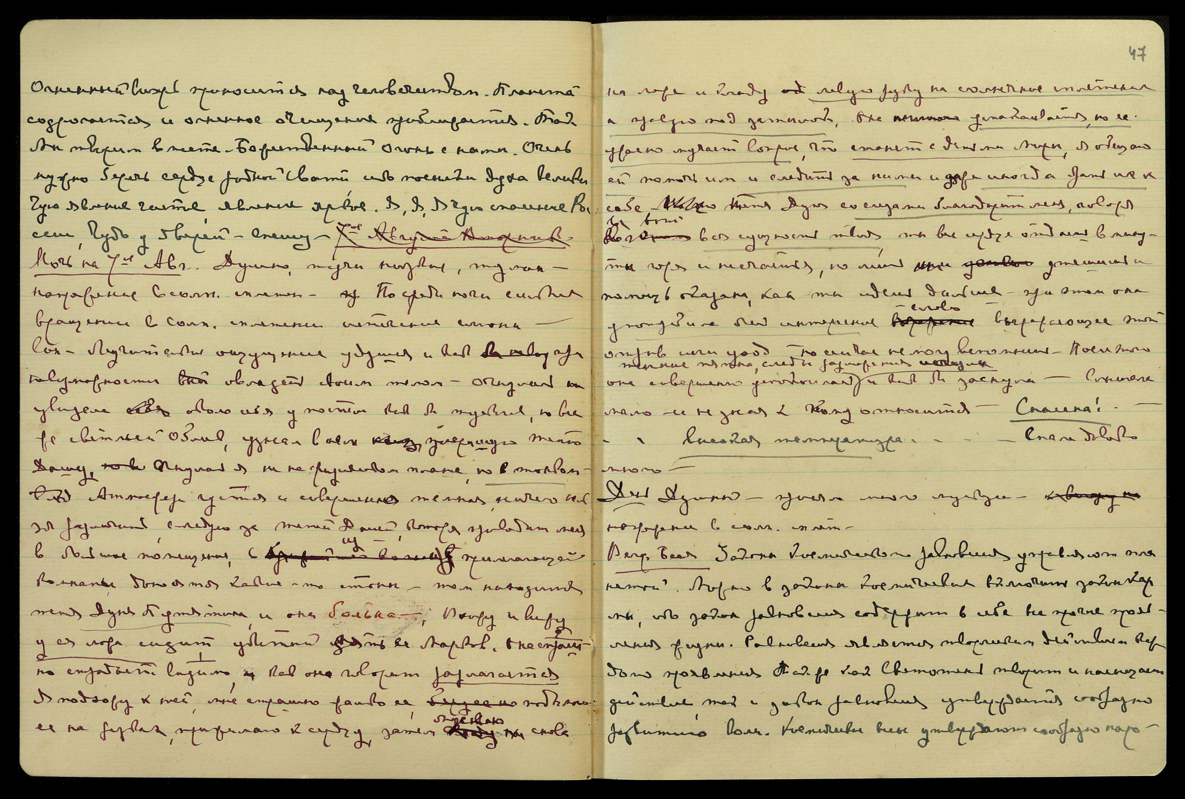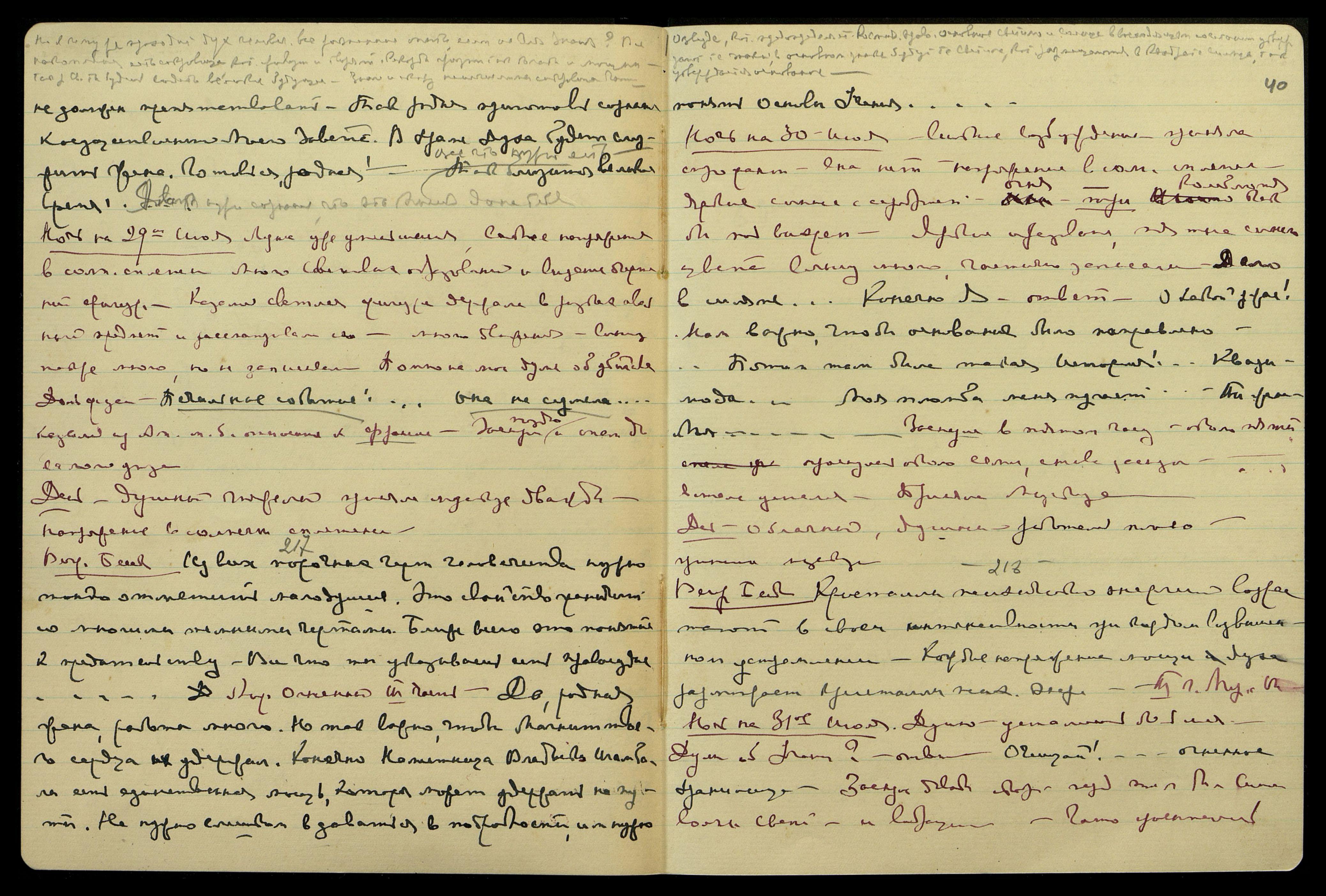 Ночь на 5 авг[уста]. Сыро, напряжение еще сильно, приняла очень много соды, напряжение постепенно улеглось, задремала. Посреди ночи встала принять еще соды, усталость ужасная до дурноты. Дремала. Под утро. Слышала: "They are entangled on [одно слово неразборчиво] [англ.: Они запутались [одно слово неразборчиво]] − так погибла и Каменская". Слышала еще.
