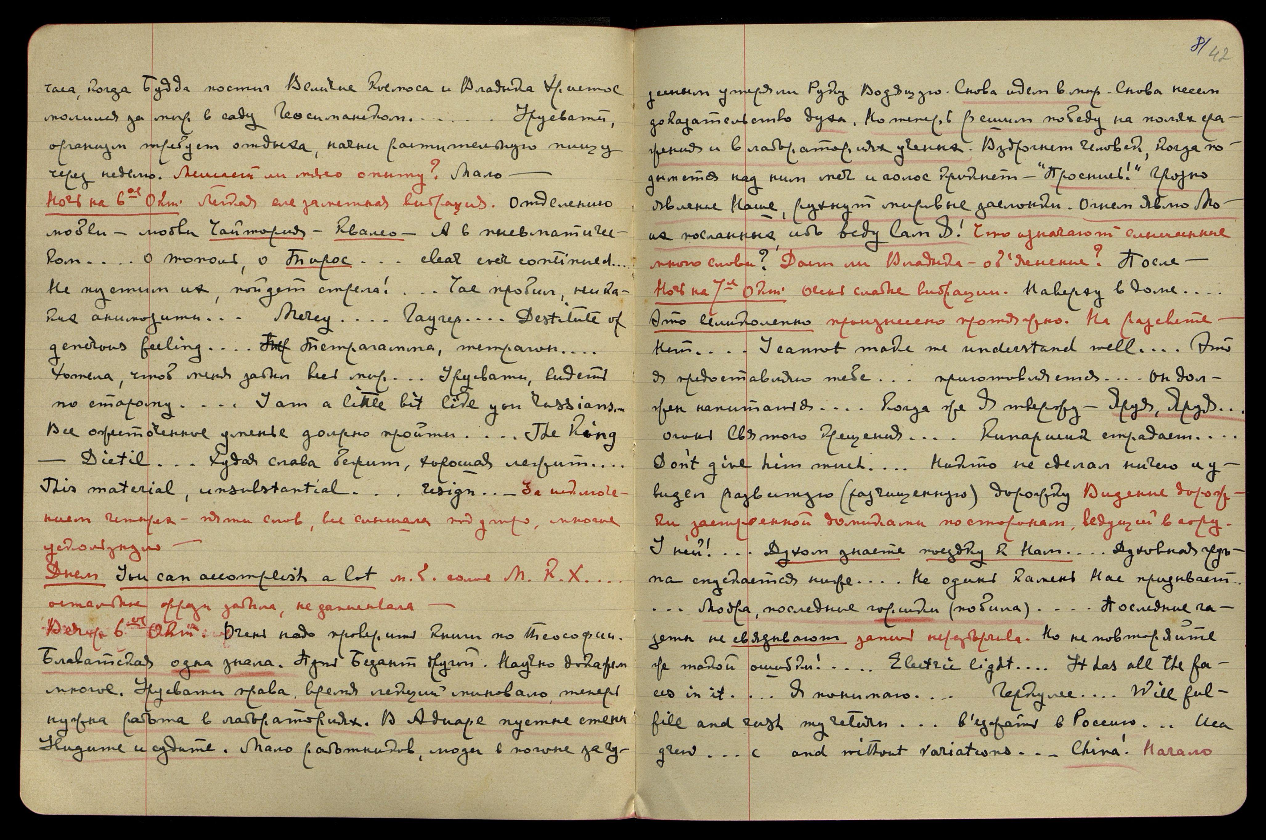 какого-то фрукта. Около шести утра: "The same example of thoughtfulness [англ.: тот же пример вдумчивости]... Qui communique avec Moi [франц.: Кто общается со мной]... Nos yeux sourire au long sommeil du [франц.: Наши глаза улыбаются долгому сну]..." Неясная запись, короткое слово. "Of which you are fond [англ.: Который вам очень нравится]... Диаметрально противоположное... В котором хранится мешечек, принесённый Блаватской... Всё, что накоплено, будет дано... По субботам Он отмечает зеркало души... Крупица дивного Света найдена и благо ему... Как Я страдала в воскресенье... Из Европы выехали... Не докончив, передашь другим... humanly [англ.: гуманно]... стремиться... Руфь... Мастер сказал − на прощание может самый лучший букет собрать... Am I your jockey [англ.: Я твой жокей]?.. Должен был пройти... кишащий змеями... Вы стали воздерживаться от пищи... Но не вызвала случившееся..." Видение Светика в его прежнем облике. Видение нашего butler'a [англ.: дворецкого], сдававшего вещи. Шум не мешал слушать. Начала вставать.