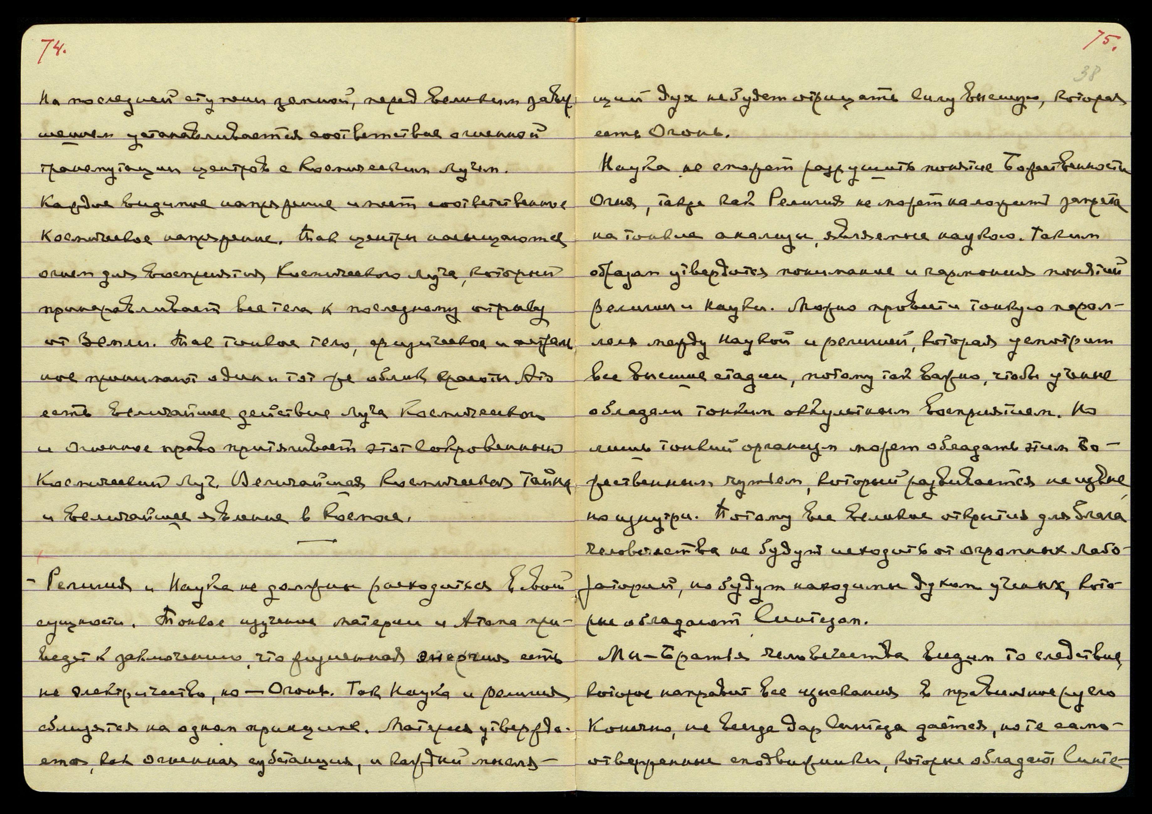 Религия и Наука не должны расходиться в своей сущности. Тонкое изучение материи и Атома приведёт к заключению, что жизненная энергия есть не электричество, но Огонь. Так наука и религия сблизятся на одном принципе. Материя утверждается, как огненная субстанция и каждый мыслящий дух не будет отрицать Силу высшую, которая есть Огонь.