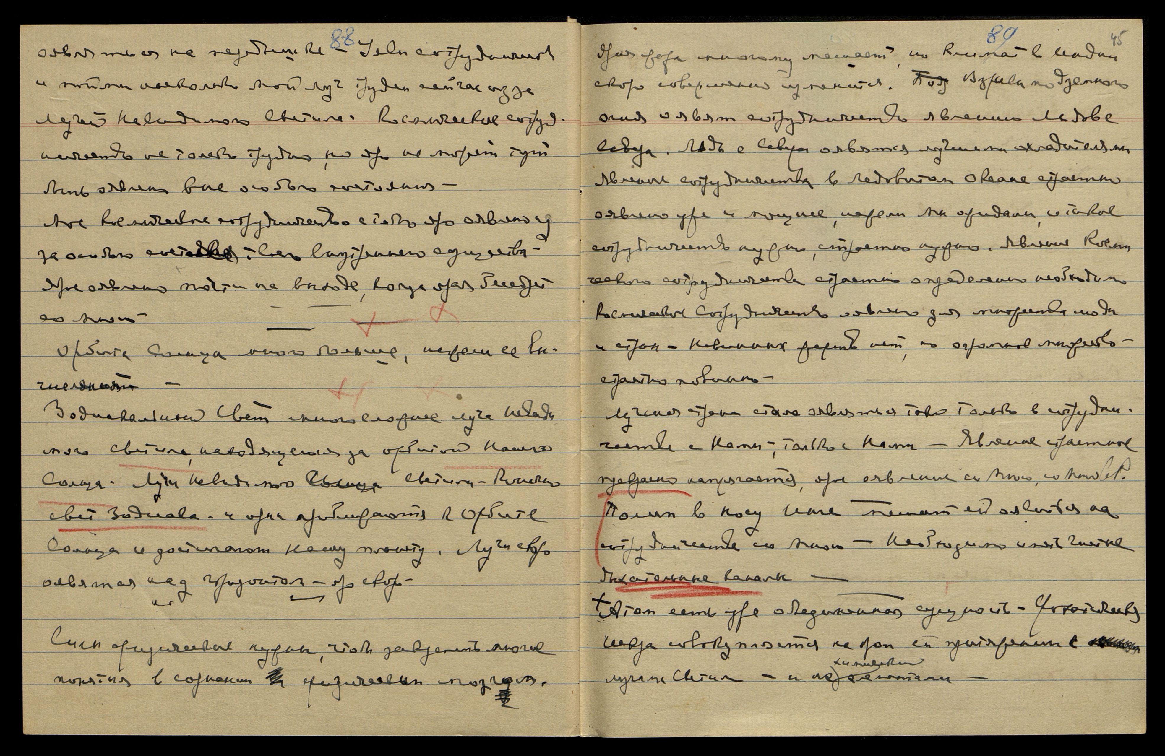 Наши оболочки становились все плотнее по мере разных сочетаний. И яро мы стали нуждаться в еще более плотных оболочках, и яро мы работали над уявлением новой ткани. Яро мы ткали с тобою более плотную ткань для высших оболочек. Моя жена предпочла тогда Люцифера — и ярая тоска Моя привлекла из Пространства странствующий Болид, кот[орый] ударил по нашей планете и уявил ей взрыв. Взрыв отнес тебя на далекое расстояние от Меня, и яро Я остался одиноким в Пространстве, окруженный вихрем осколков планеты.