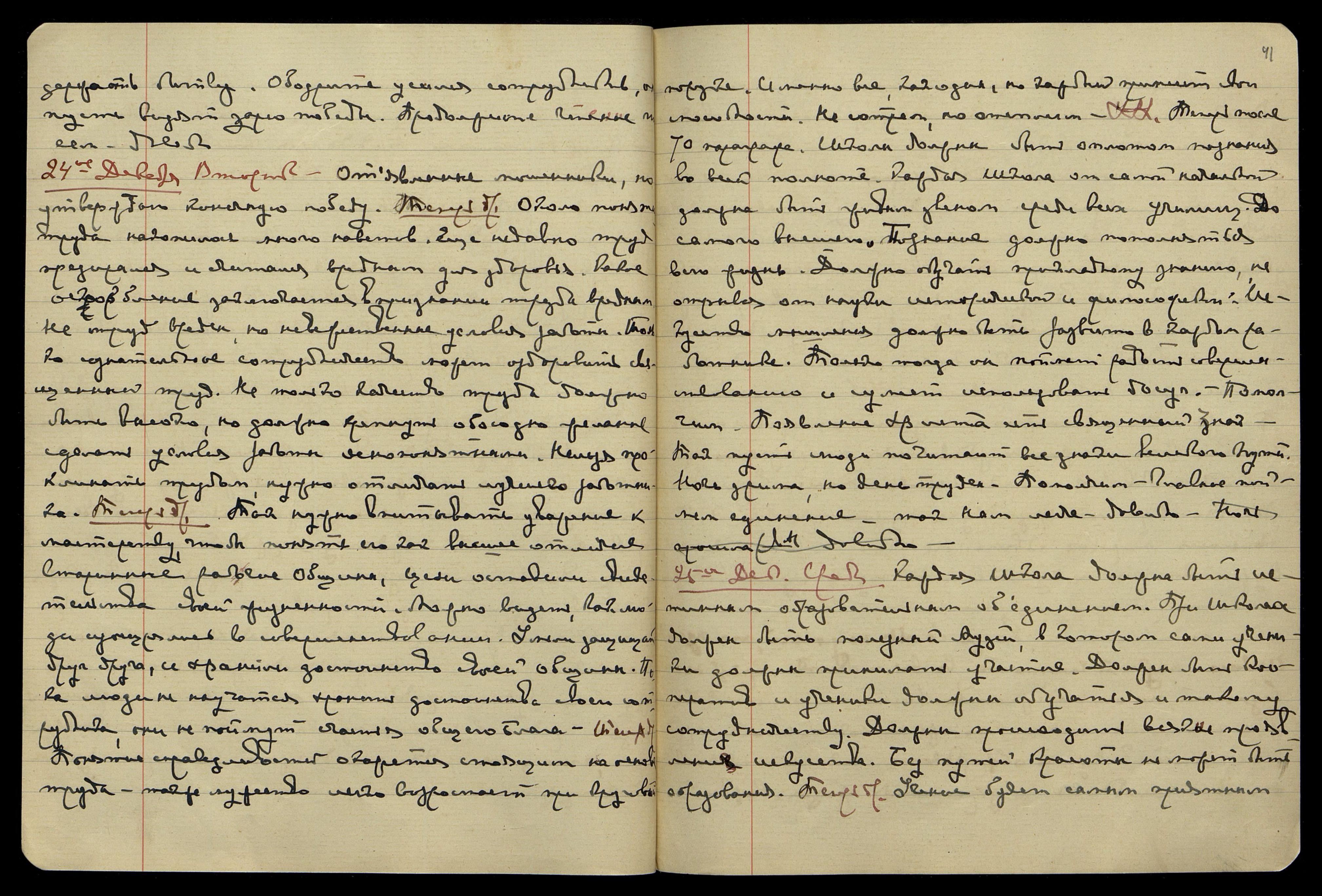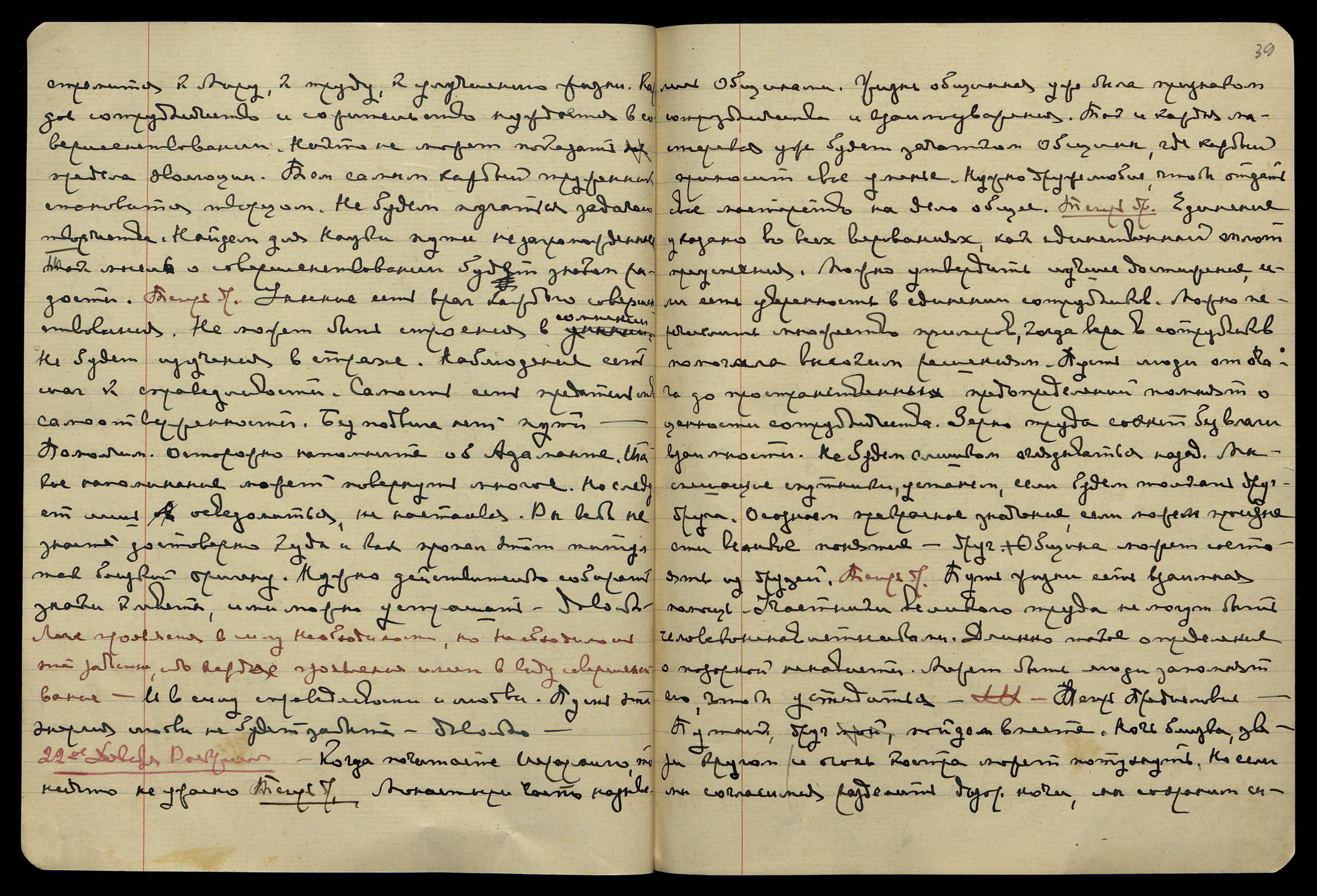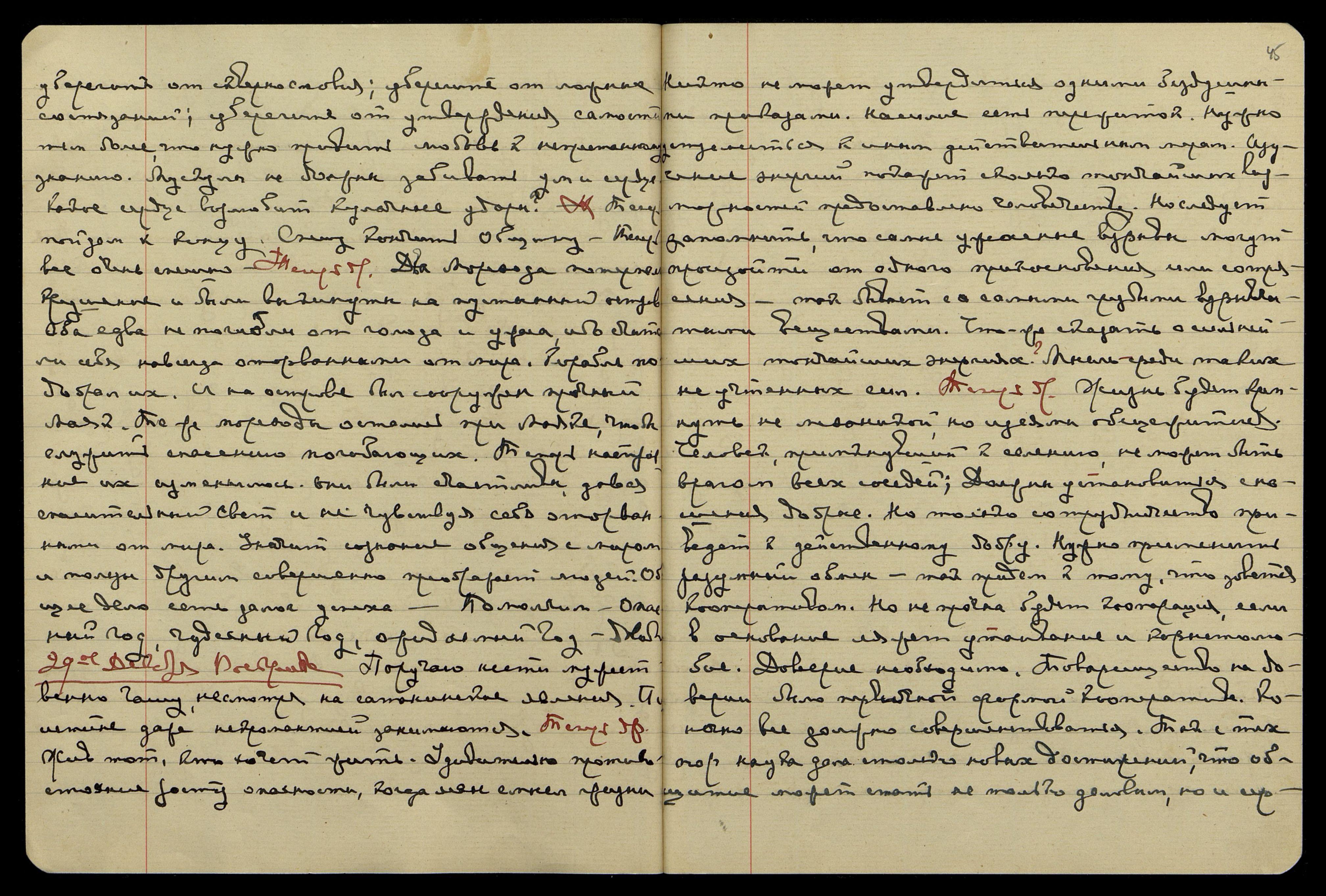 Теперь др[угое]. Мир есть венец сотрудничества. Знаем много равнозначащих понятий: сотрудничество, содружество, община, кооператив, те самые сердечные объединительные основы как Маяки во тьме. Не пугаться должны люди при мысли о счастье ближних, но радоваться нужно, ибо счастье ближнего есть наше счастье.