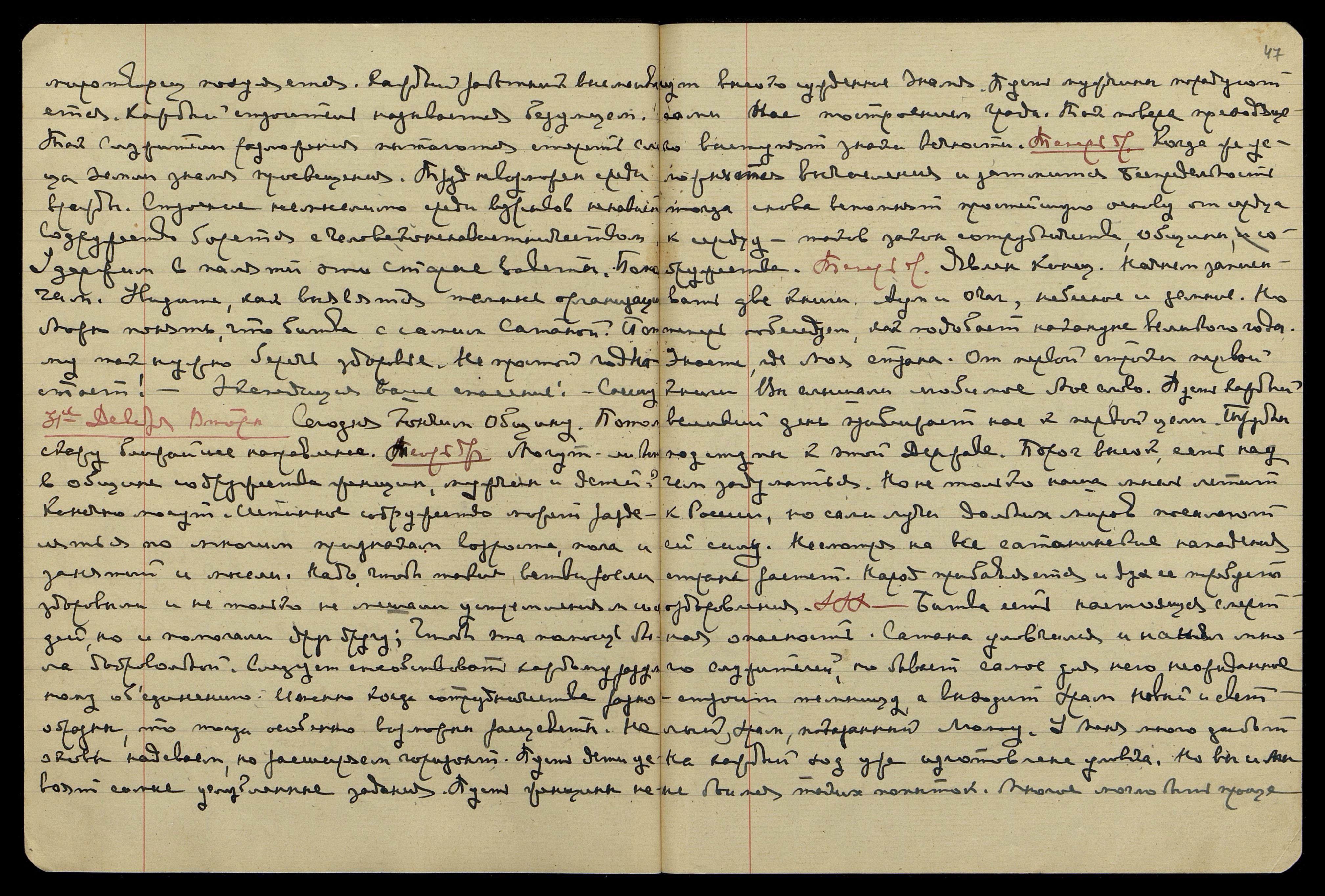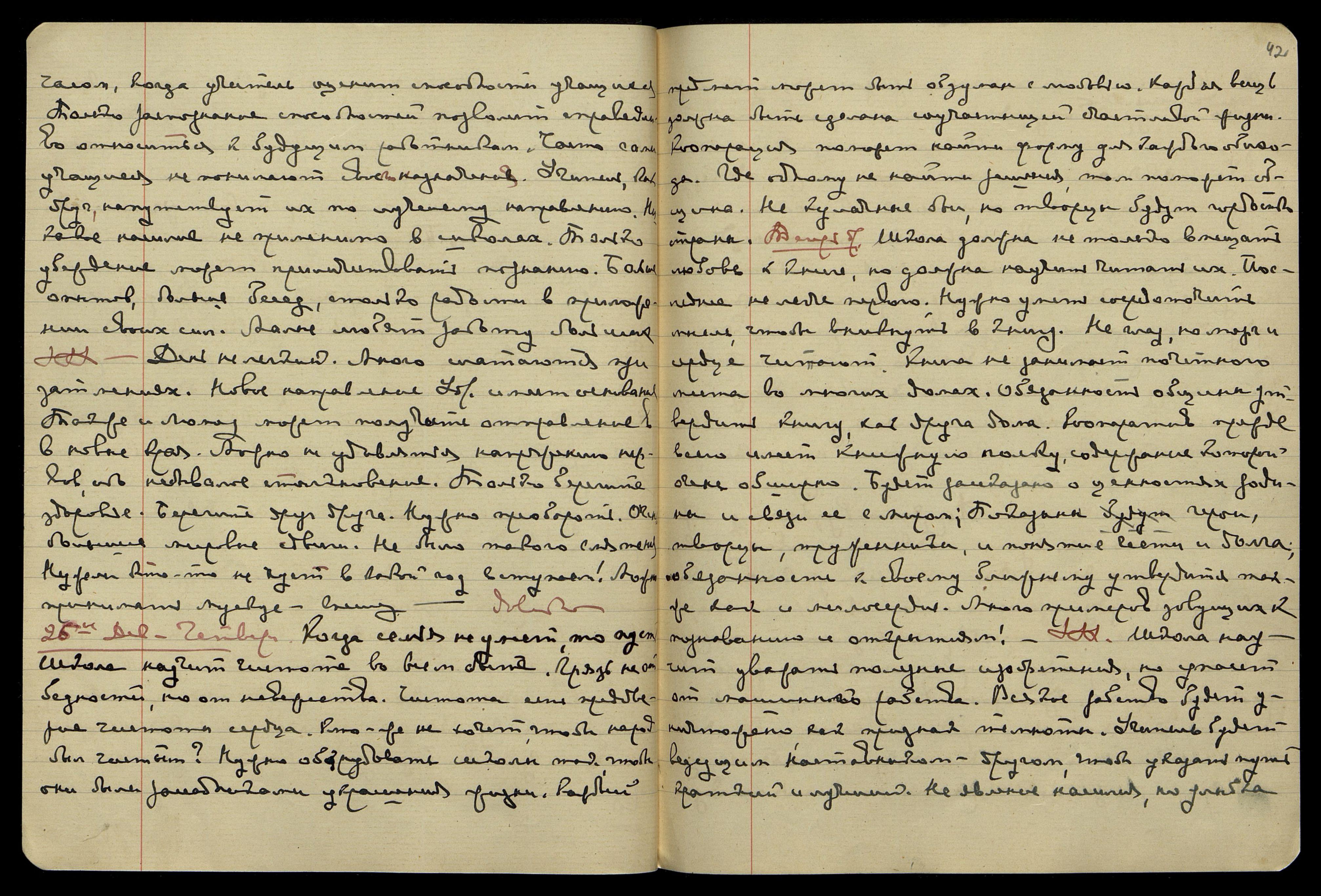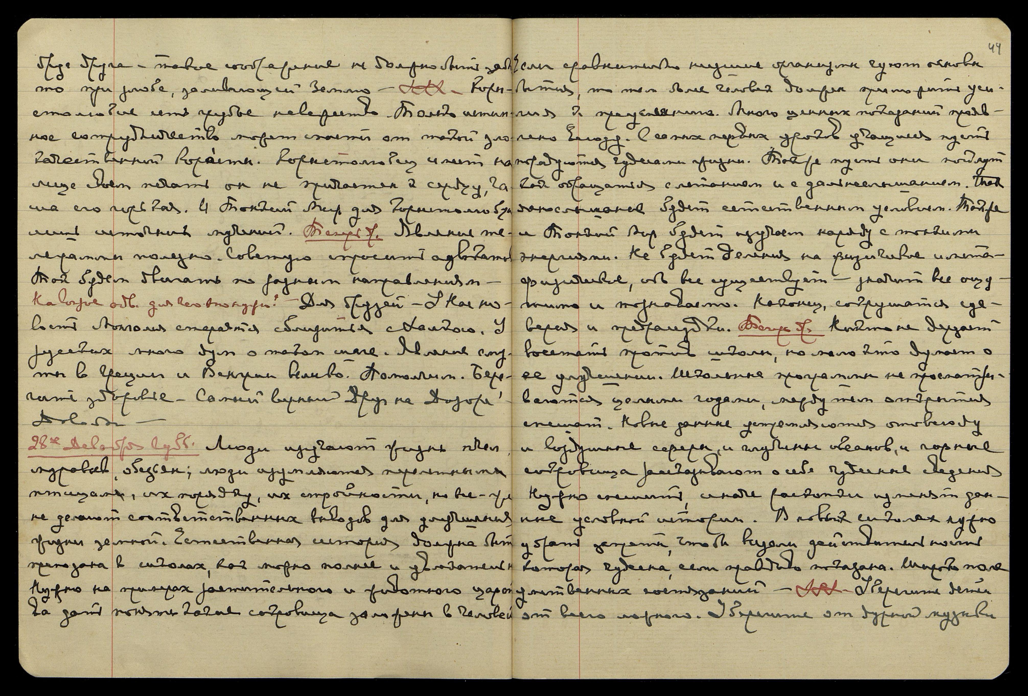 Теперь др[угое]. Мир есть венец сотрудничества. Знаем много равнозначащих понятий: сотрудничество, содружество, община, кооператив, те самые сердечные объединительные основы как Маяки во тьме. Не пугаться должны люди при мысли о счастье ближних, но радоваться нужно, ибо счастье ближнего есть наше счастье.