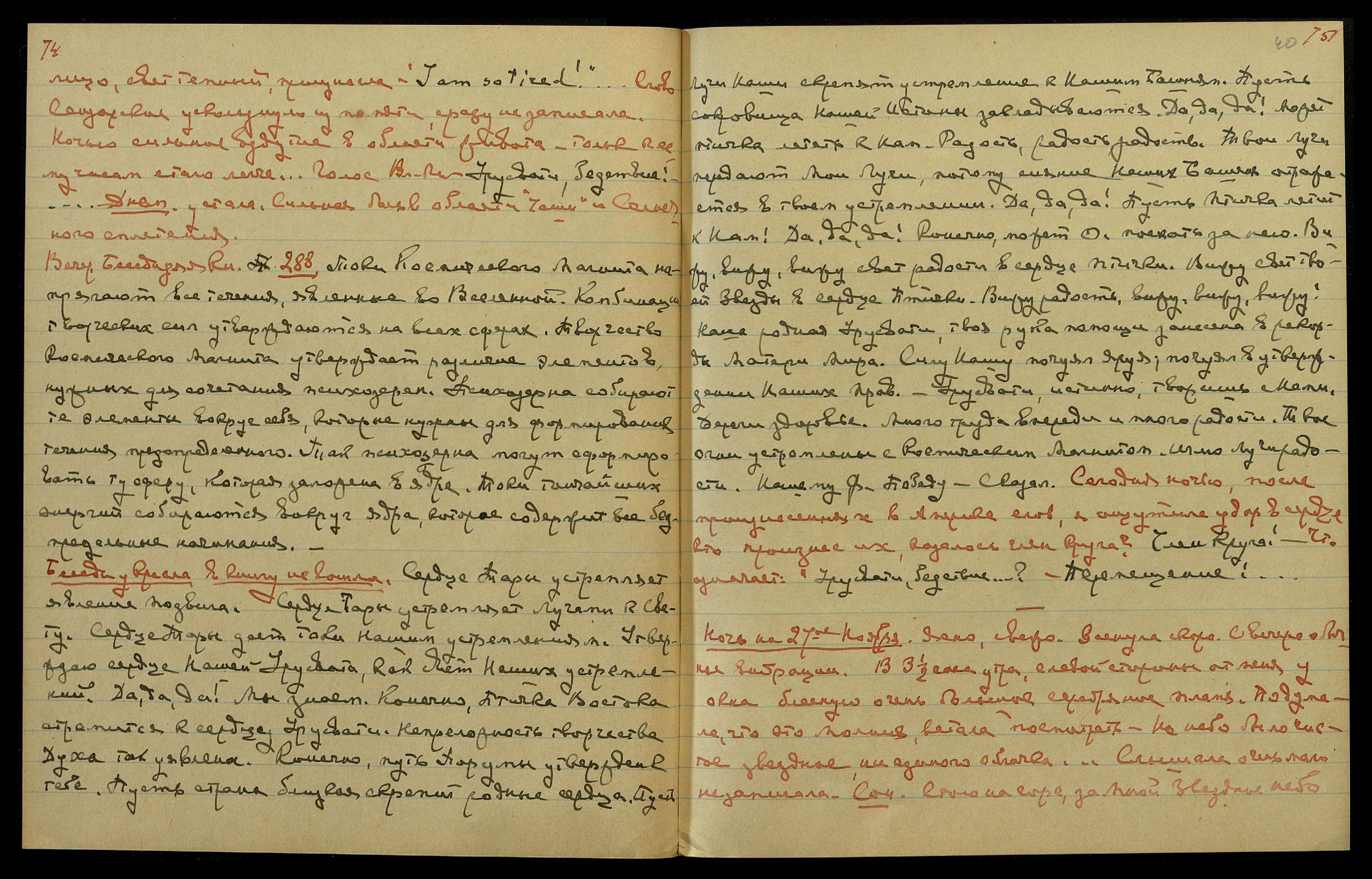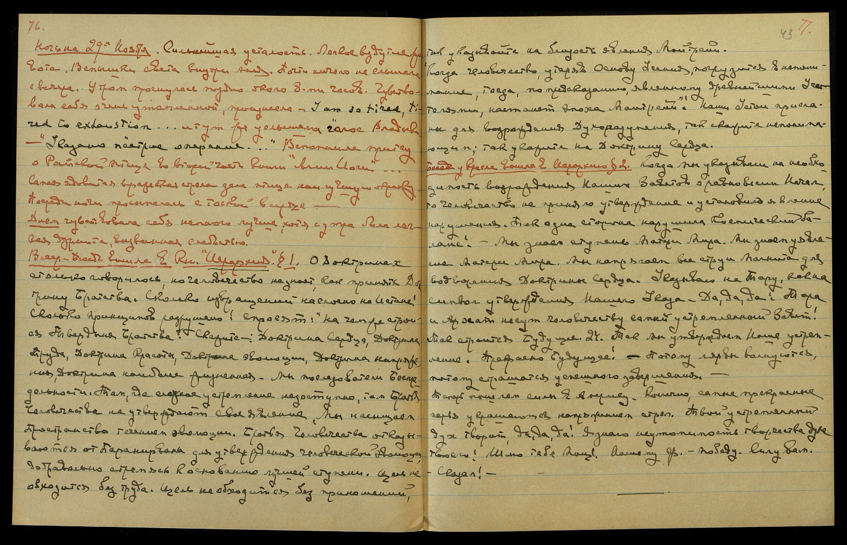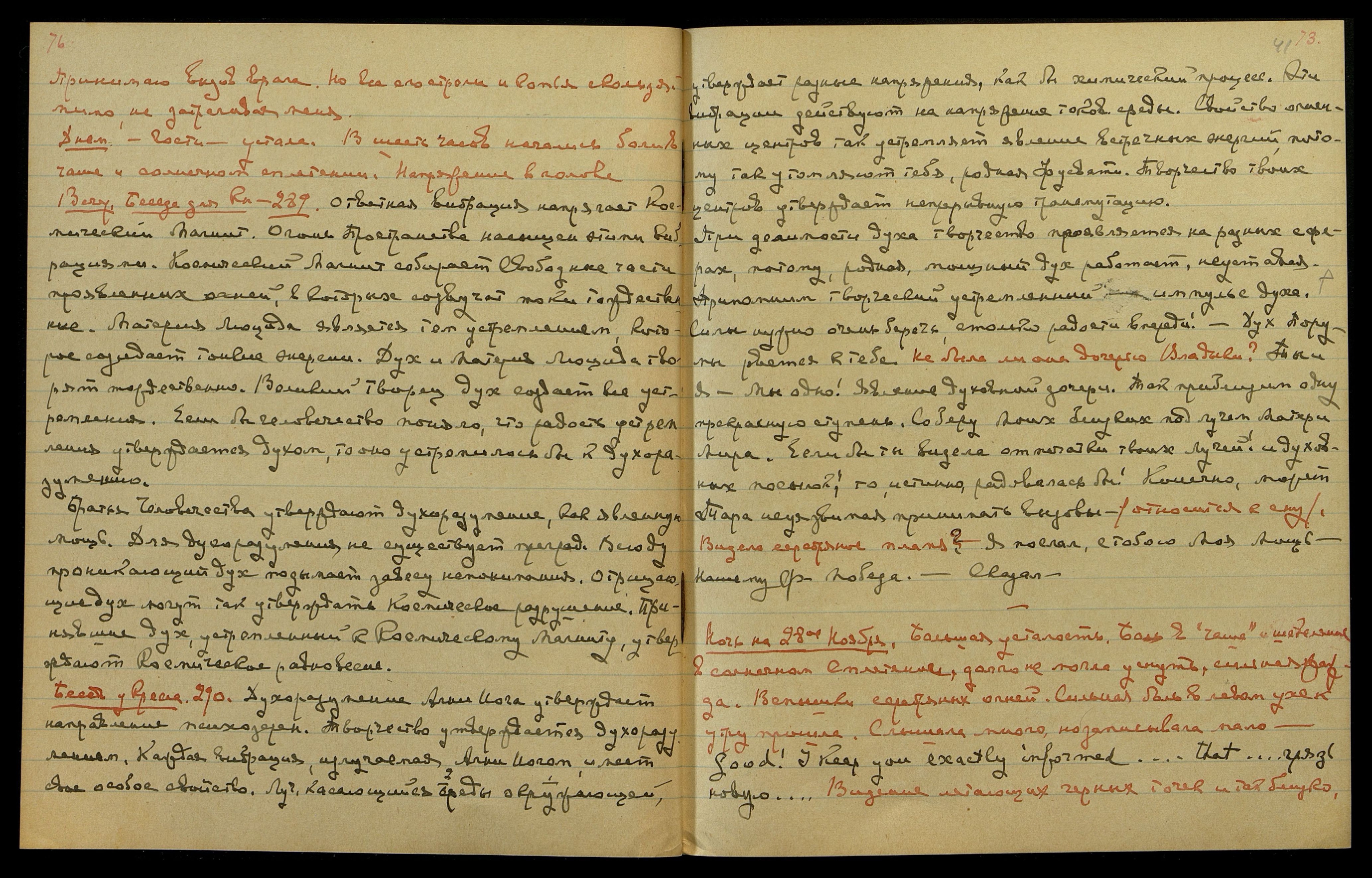 Ночь на 26-ое ноября. Ночь теплая, облачная. Большая усталость. С вечера красная вспышка, услышала: «Очень жаль, очень жаль!... Ой, как у меня… последняя фраза сопровождалась ударом в сердце… Видение нашего управляющего, сказавшего мне: I would not like to borrow you any more [Я бы не хотел больше брать у тебя взаймы – прим. наборщика]. Видение Яруи испуганного и затемненного. Видение miss Russell - очень искаженное