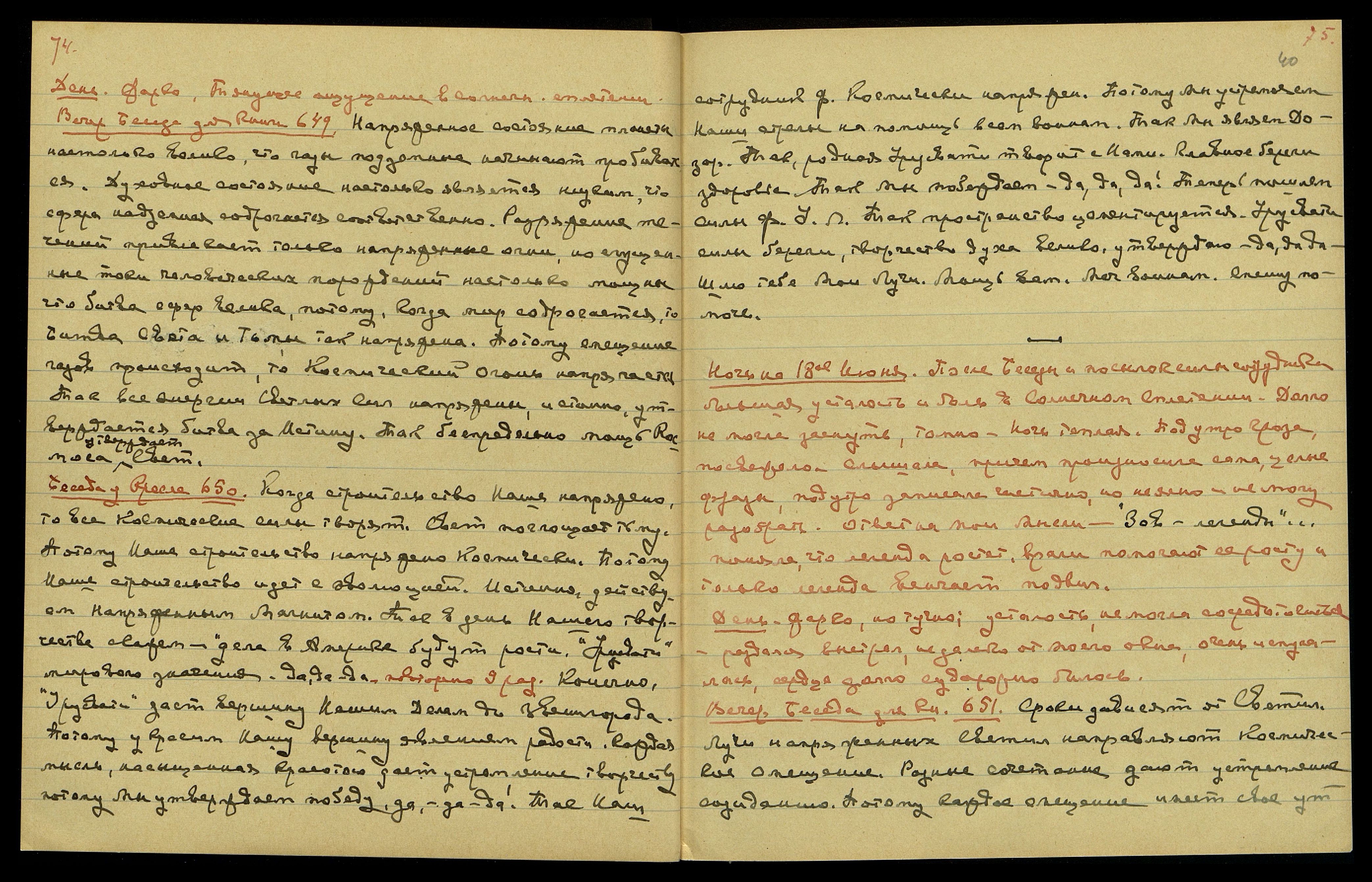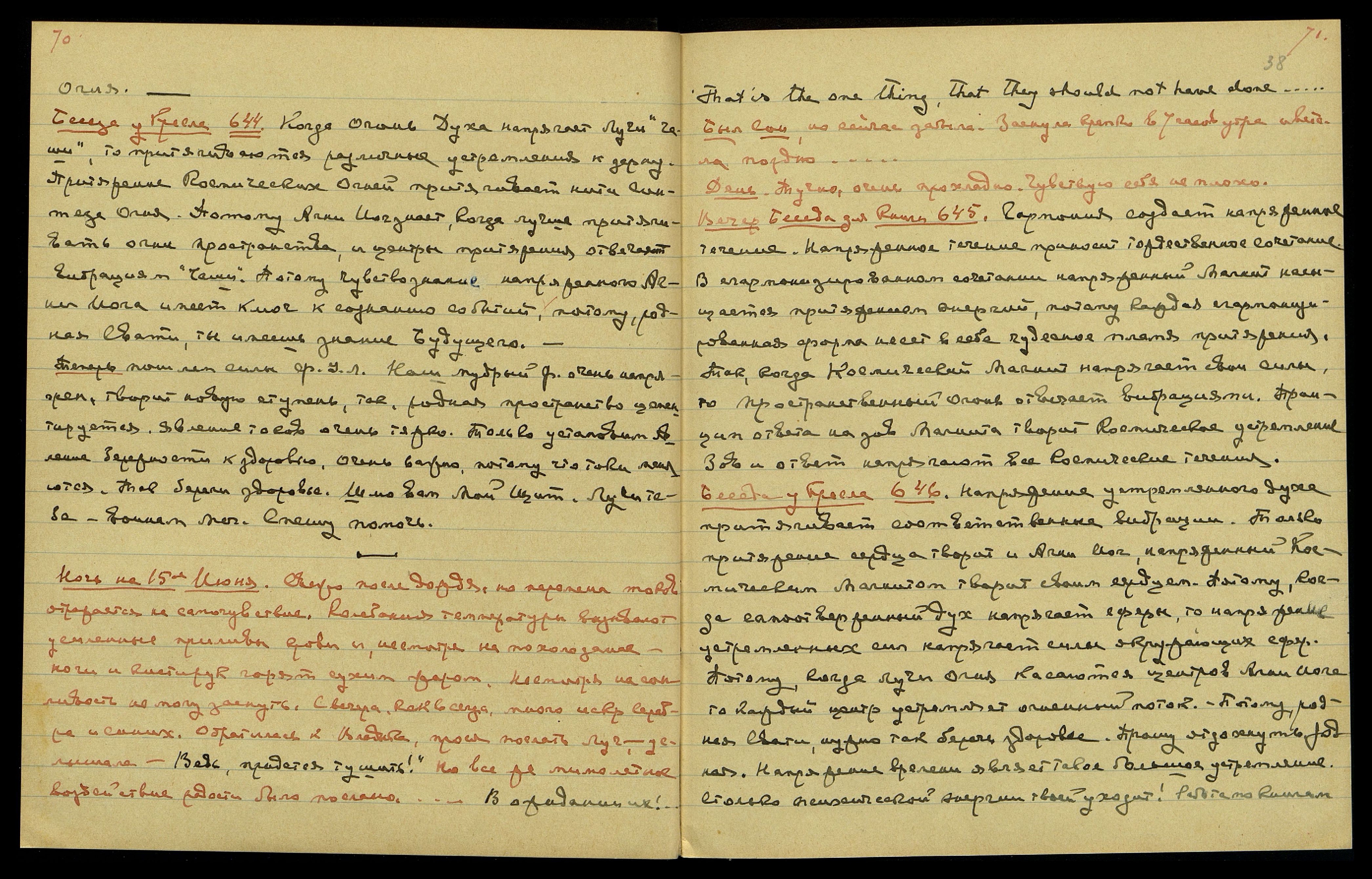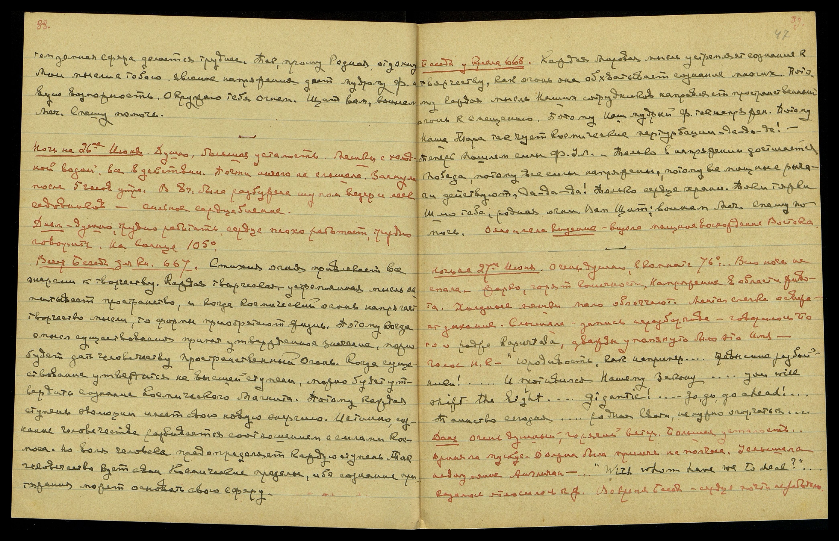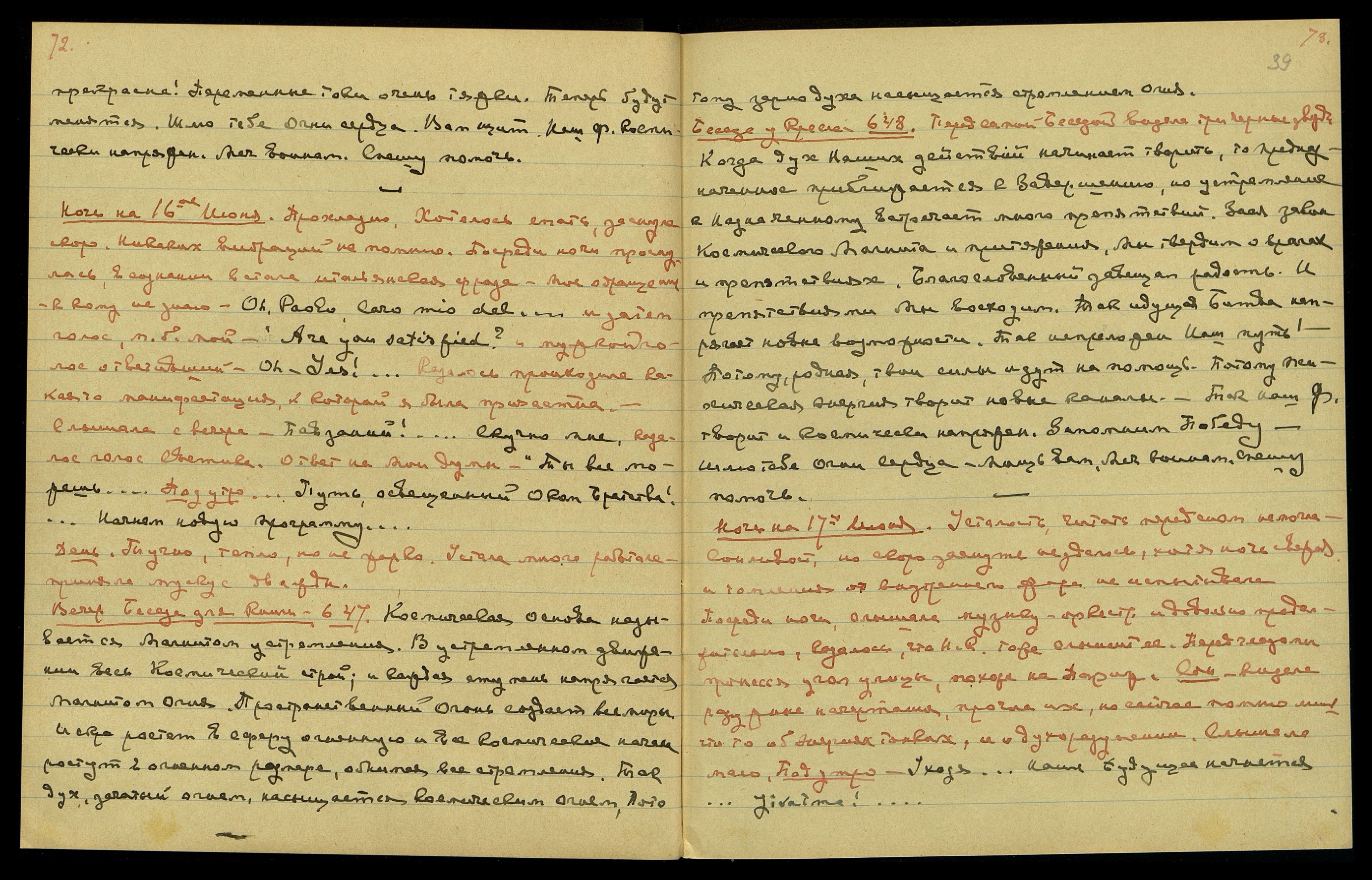 Ночь на 27-ое июня. Очень душно, в комнате 76°F [= 24,4°C]. Всю ночь не спала − жарко, горят конечности. Напряжение в области живота. Холодные мешки мало облегчают. Ментол слегка освежает дыхание. Слышала. Запись неразборчива − говорилось что-то о "радже Rapurtala". Дважды упомянуто было это имя. Голос Н[иколая] К[онстантиновича]: "Юродивость, как, например..." "Превысили разбойники!.. И противился Нашему закону... you will shift light... gigantic!.. go, go, go ahead! [англ.: Вы будете перемещать свет... гигантский... вперёд, вперёд, вперёд!] Таинство сегодня... родная Свати, не нужно огорчаться..."