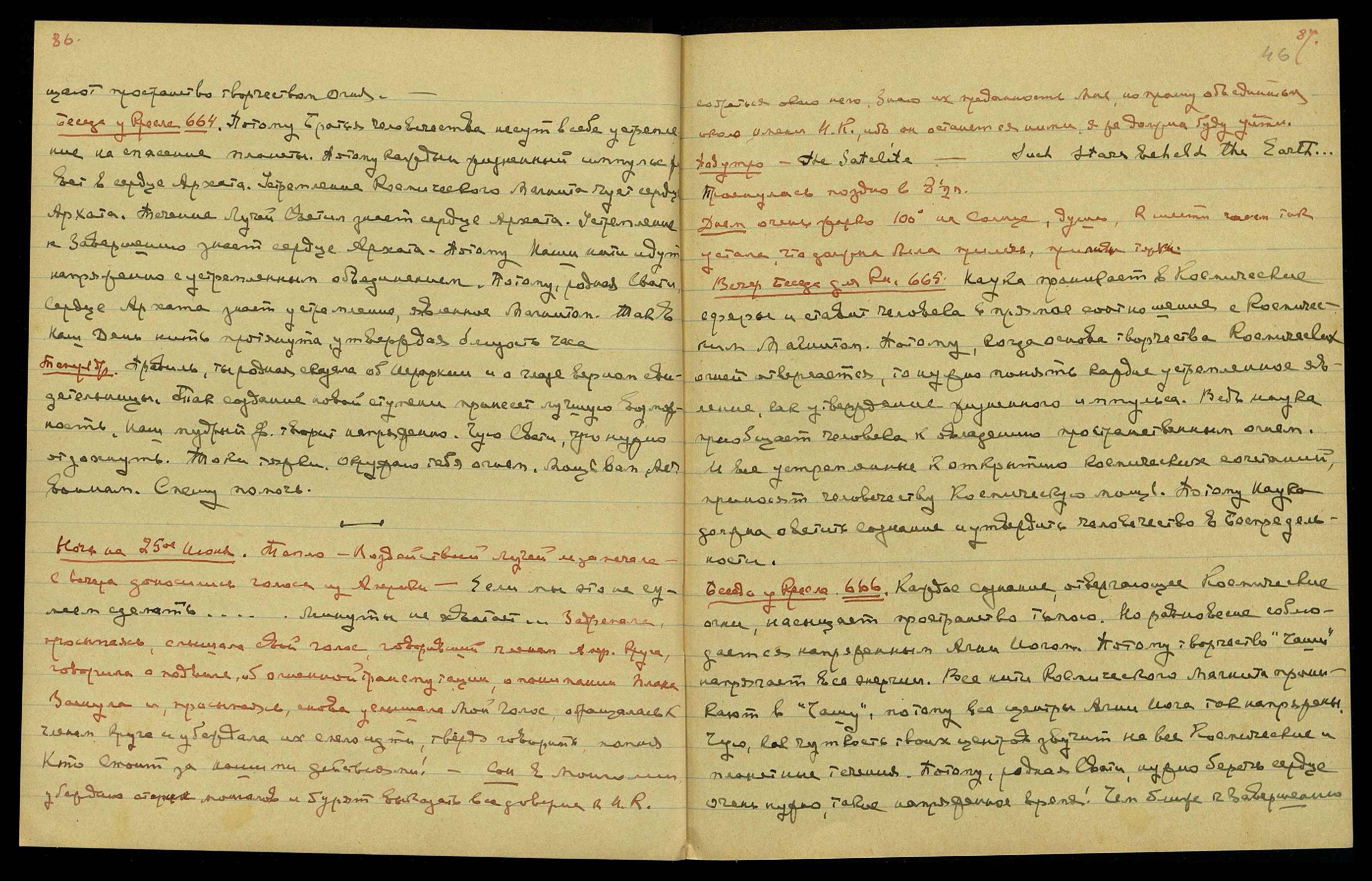 Ночь на 25-ое июня. Тепло. Воздействие Лучей не замечала. С вечера доносились голоса из Америки. "Если мы это не сумеем сделать... Минуты не хватает..." Задремала, просыпаясь, слышала свой голос, говоривший членам амер[иканского] Круга. Говорила о подвиге, об огненной трансмутации, о поношении Плана. Заснула и, просыпаясь, снова услышала мой голос, обращалась к членам Круга и убеждала их смело идти, твёрдо говорить, помня Кто стоит за нашими действиями! Сон. В Монголии убеждаю старых монголов и бурят выказывать всё доверие к Н[иколаю] К[онстантиновичу], собраться около него. Знаю их преданность мне, но прошу объединиться около имени Н[иколая] К[онстантиновича], ибо он останется с ними, я же должна буду уйти. Под утро. "The satellite. Such stars beheld the earth... [англ.: Спутник. Такие звёзды созерцала Земля...]" Проснулась поздно − в 8 1/2 ч.