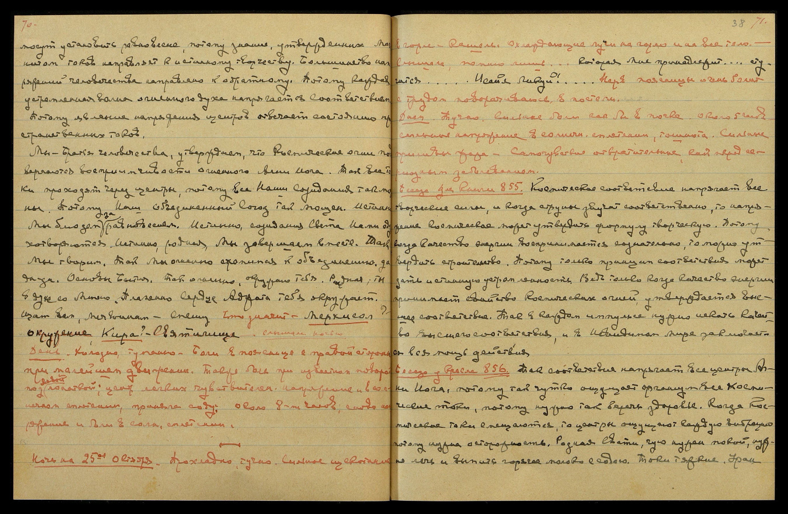 Ночь на 27-ое окт[ября]. Ясно, очень свежо, но мне тепло. Боль в центре почек, боль передается левому разветвлению центра легких. Трудно менять положение, поворачиваться на другой бок. Очень мало слышу и не записываю. Видение серебристо-розово-рубинового пламени, как бы, чем-то прикрытого сверху.