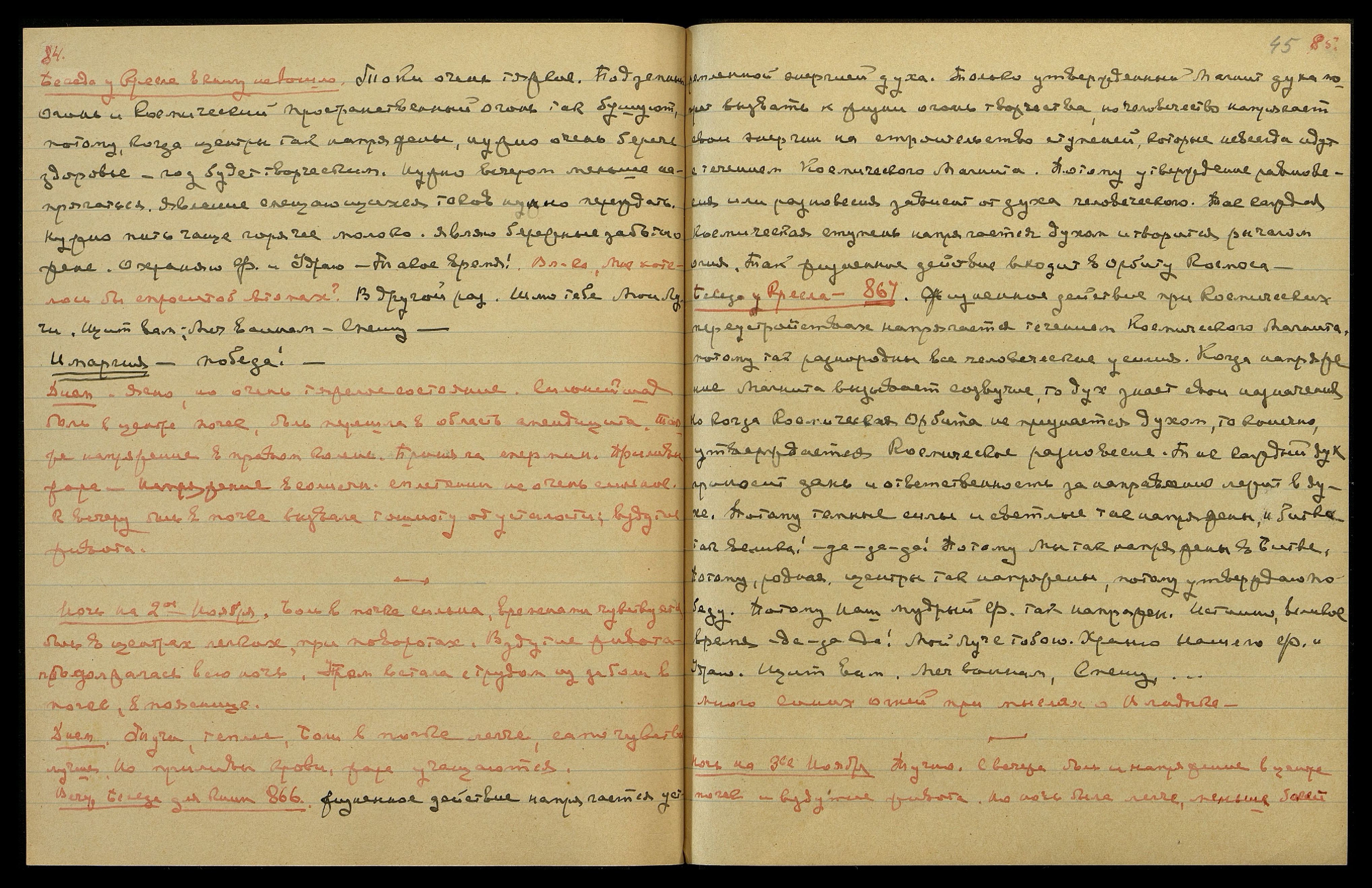 После Беседы сильная боль и напряжение в солнечн[ом] сплетении. Получена почта из Америки и Порт Саида. С Н[иколаем] К[онстантиновичем] и Юр[ием] едет врач. Порума взяла сильную ноту в Америке. Новости сильно взволновали меня — руки в иглах, головная боль!