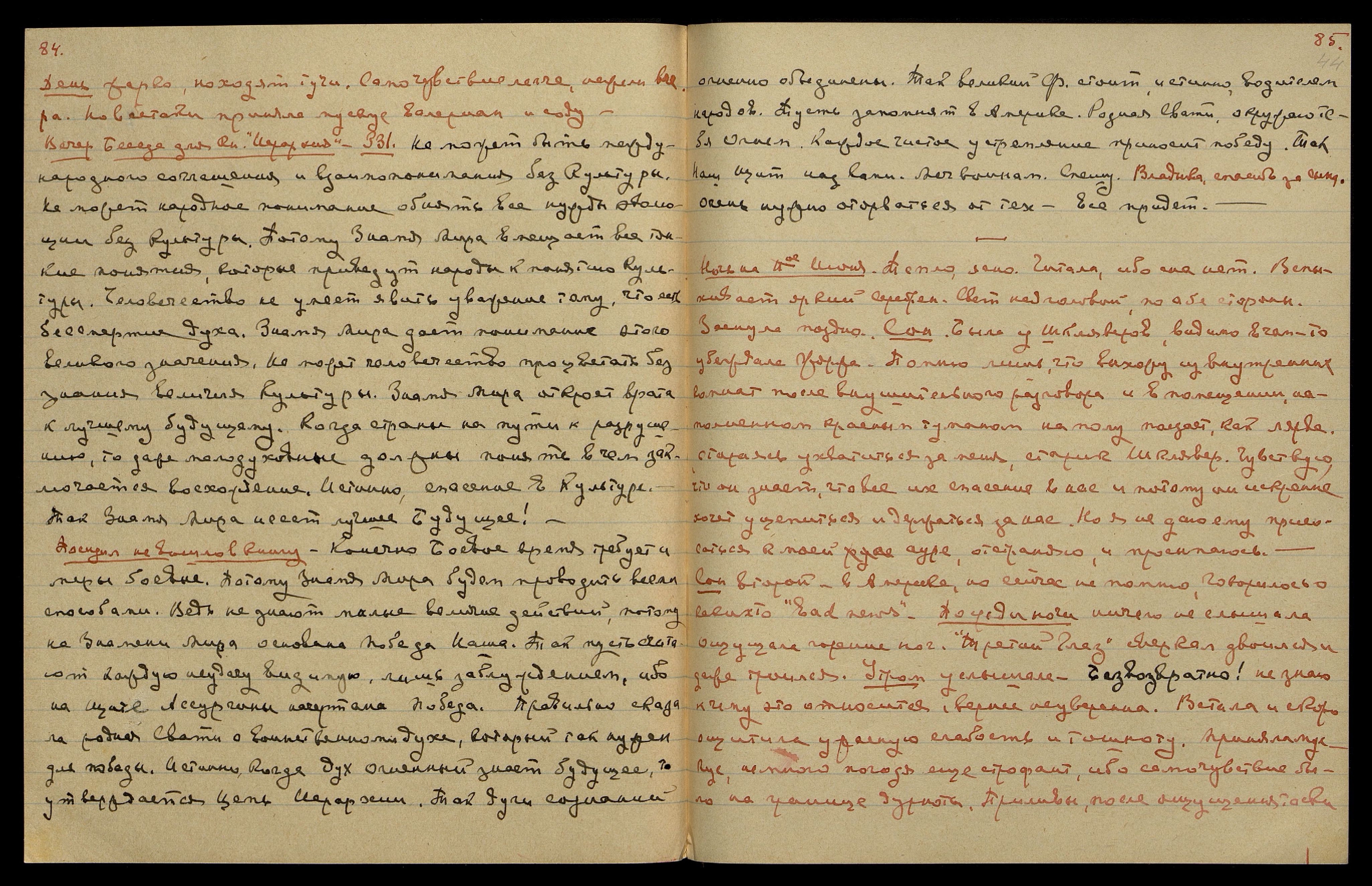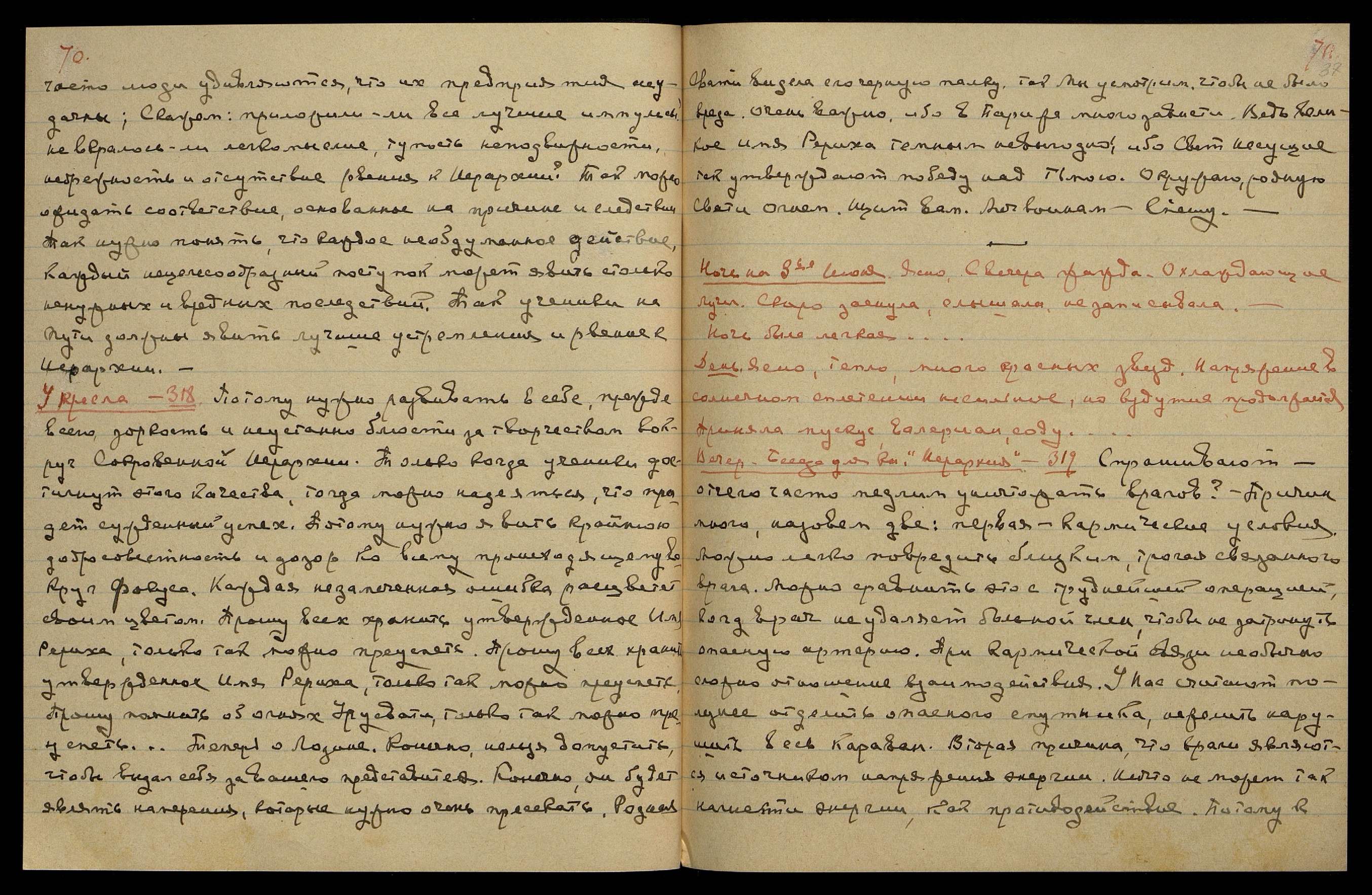 Теперь др[угое]. Нужно понять всю сущность мировой борьбы, когда вместо газов летают снаряды психической энергии. Нужно наблюдать небывалое событие, чтобы толпа требовала смерти Папы в сердце Ватикана. Ведь такой жар-цвет не расцветал еще никогда! Останется понятие Культуры. И вы правы, предполагая мировую диктатуру Культуры! К тому ведем, и в Росс-Азии можно двинуть только этим понятием. Полезно записать события этого года, начиная с requiem’a банков!