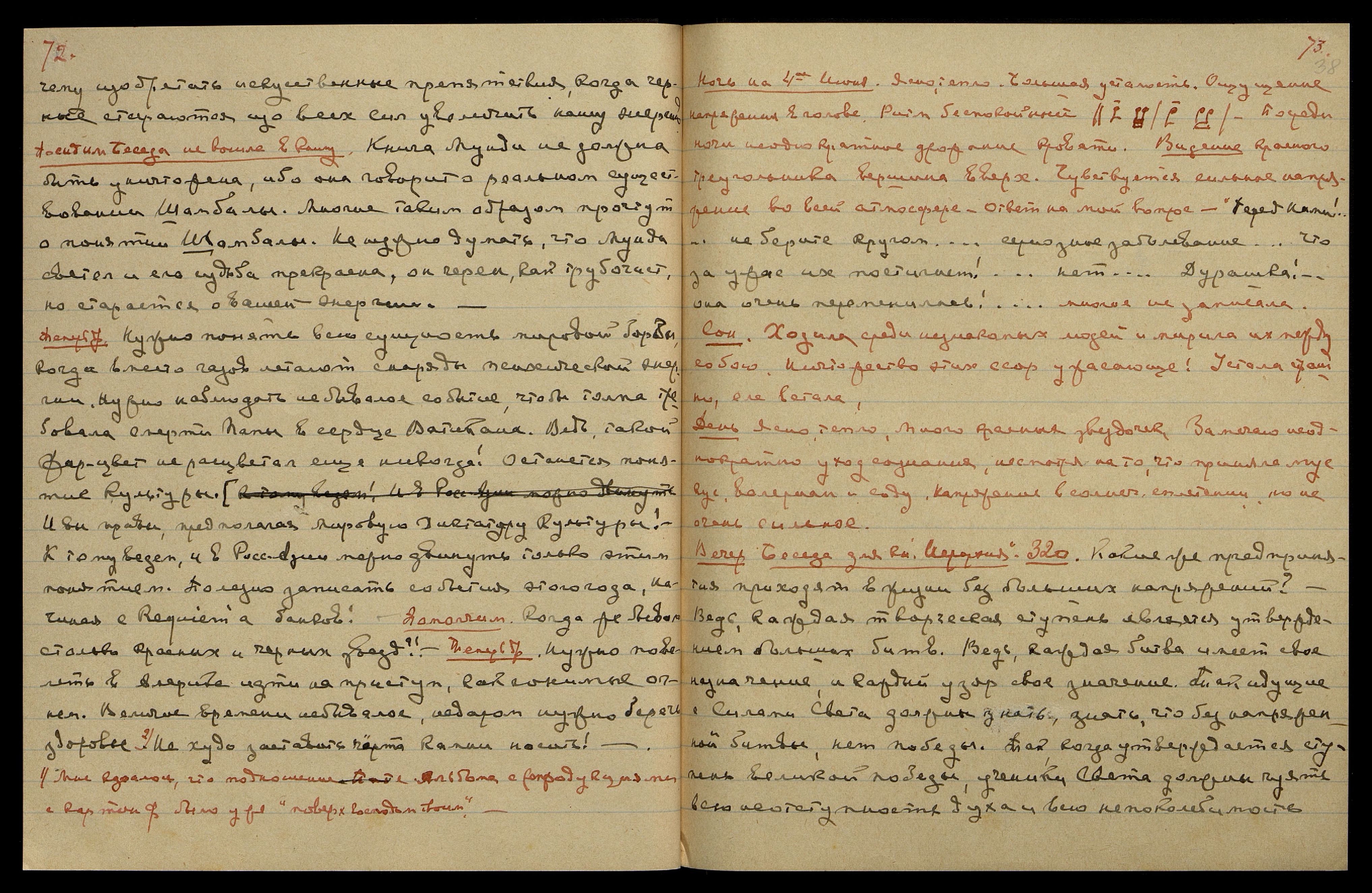 Ночь на 9-ое июня. Ясно, тепло. Сильное вздутие. Света обычные, синие звезды очень крупные. Сна нет. Неоднократно замечала дрожание кровати, также пропускание тока через мой организм. Слышала и, как всегда, не все записала. Beautiful, wondrous construction! [англ.: Красивое, удивительное сооружение].. деньги возьми... Елена Ивановна!.. Шкапы их ломятся!.. Они не поймут, что в каждом...", — неясная запись, — "...лежит... какое чудо!". Думы о Катрин. "Печальна... как без стекла!.. Опомнитесь!.. Это самое ужасное... Безвкусица!". Томление, ни малейшего сна, вздутие в области живота велико, несмотря на очень малое количество пищи. Заснула после четырех, чтобы уже в 5[и]1/2 проснуться. Около 7-ми заснула до 8-ми. Встала с трудом, как всегда болит спина.