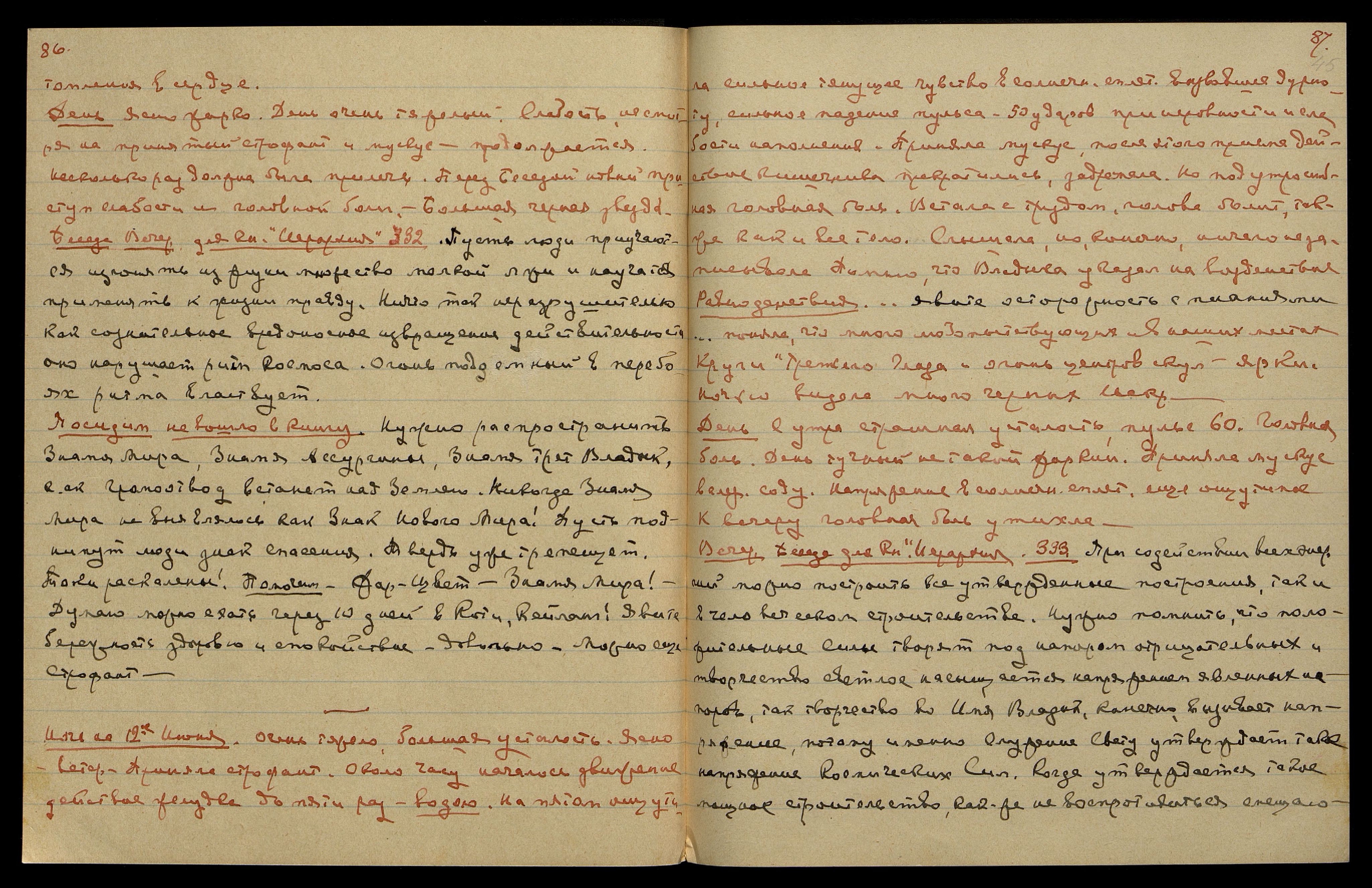 Ночь на 12-ое июня. Очень тяжело, большая усталость. Ясно, ветер. Приняла строфант. Около часу началось движение, действие желудка до пяти раз — водою. На пятом ощутила сильное тянущее чувство в солнечн[ом] сплет[ении], вызвавшее дурноту, сильное падение пульса — 50 ударов при неровности и слабости наполнения. Приняла мускус, после этого приема действие кишечника прекратилось, задремала. Но под утро сильная головная боль. Встала с трудом, голова болит также, как и все тело. Слышала, но, конечно, ничего не записывала. Помню, что Владыка указал на воздействие Равноденствия. "Явите осторожность с писаниями...", — поняла, что много любопытствующих и в наших местах.