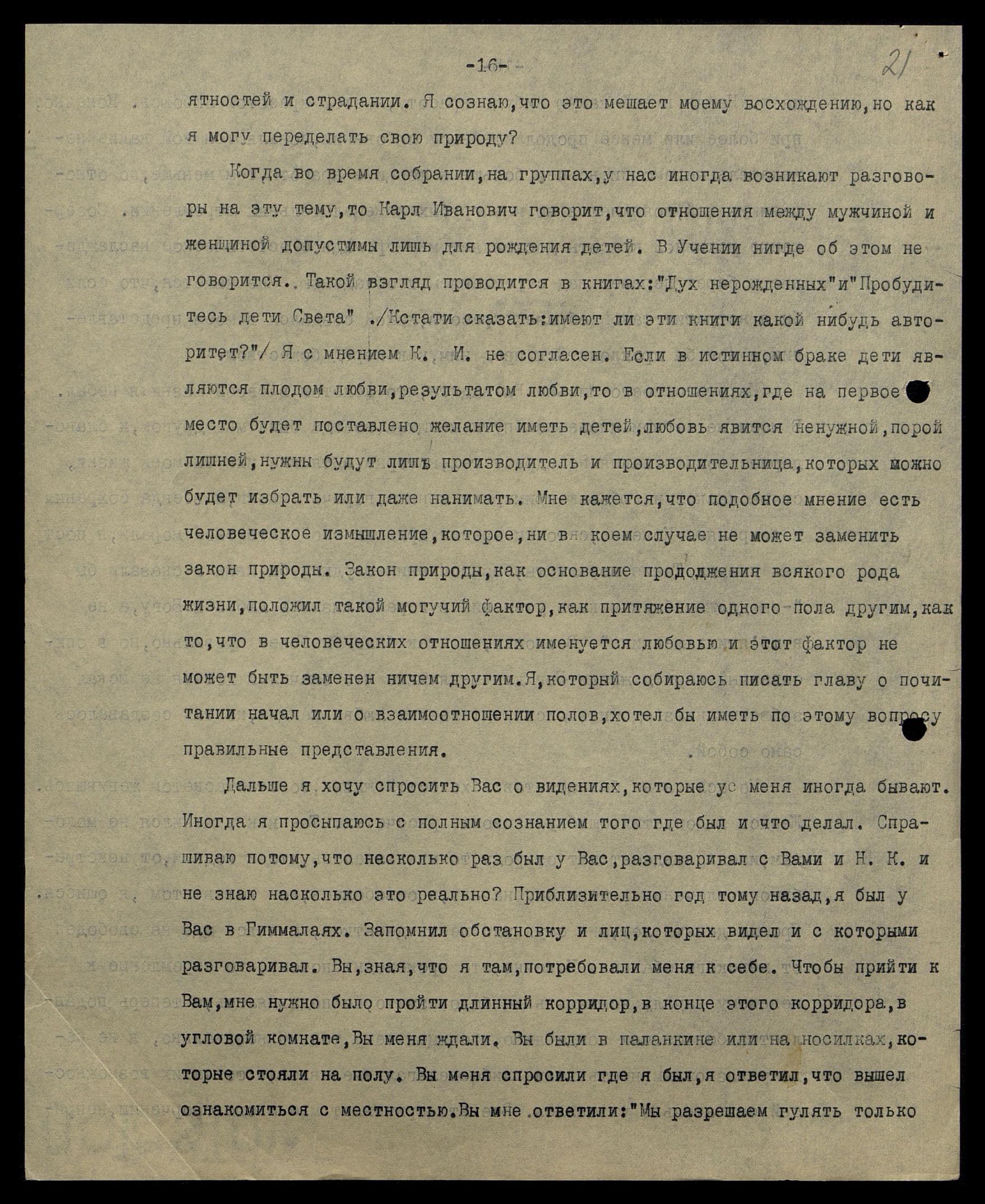 Когда во время собрании, на группах, у нас иногда возникают разговоры на эту тему, то Карл Иванович [Стуре] говорит, что отношения между мужчиной и женщиной допустимы лишь для рождения детей. В Учении нигде об этом не говорится. Такой взгляд проводится в книгах: "Дух нерожденных" и "Пробудитесь дети Света". (Кстати сказать: имеют ли эти книги какой-нибудь авторитет?") Я с мнением Карла Ивановича не согласен. Если в истинном браке дети являются плодом любви, результатом любви, то в отношениях, где на первое место будет поставлено желание иметь детей, любовь явится ненужной, порой лишней, нужны будут лишь производитель и производительница, которых можно будет избрать или даже нанимать. Мне кажется, что подобное мнение есть человеческое измышление, которое ни в коем случае не может заменить закон природы. Закон природы, как основание продолжения всякого рода жизни, положил такой могучий фактор, как притяжение одного пола другим, как то, что в человеческих отношениях именуется любовью и этот фактор не может быть заменен ничем другим. Я, который собираюсь писать главу о почитании начал или о взаимоотношении полов, хотел бы иметь по этому вопросу правильные представления.