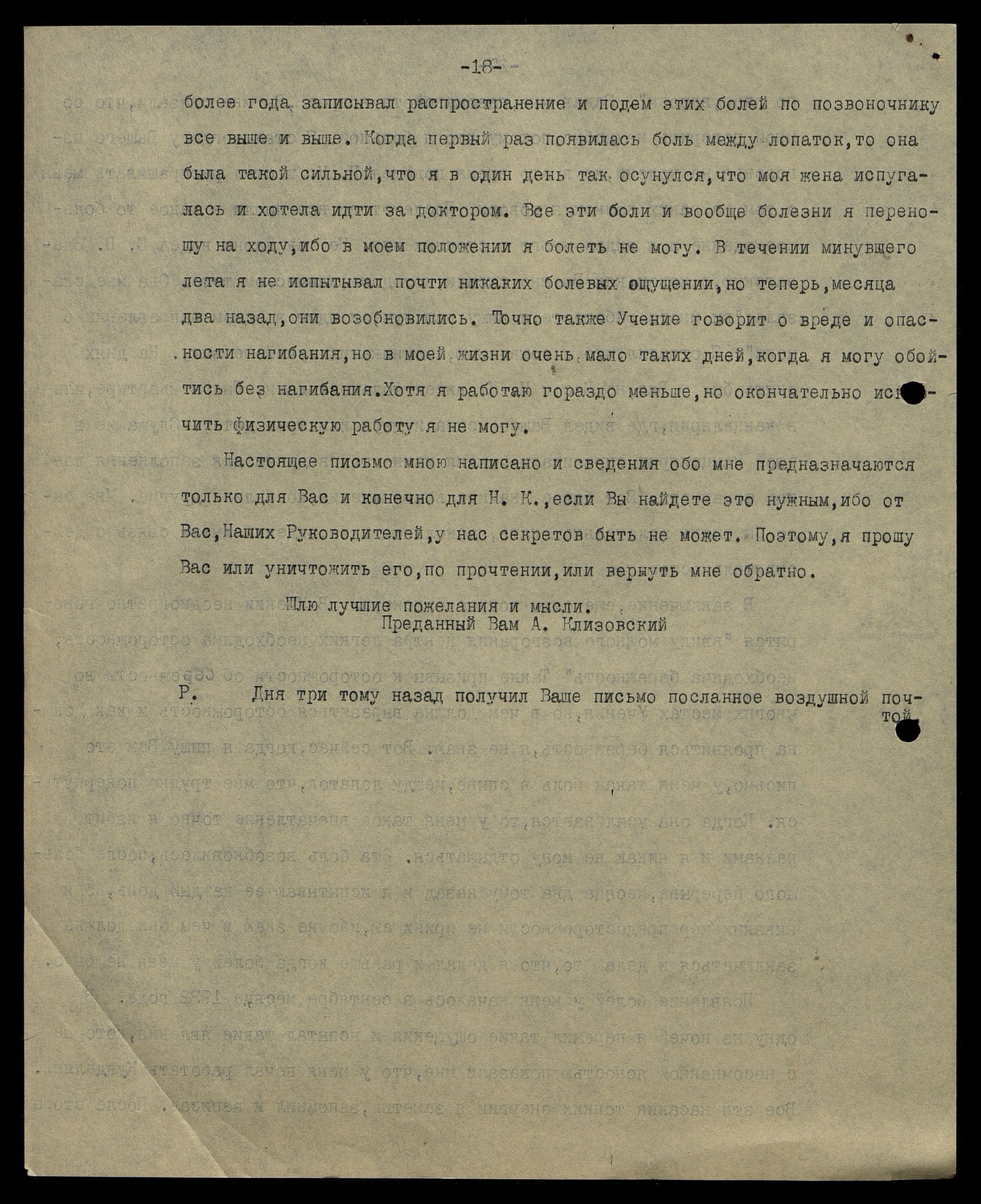 Настоящее письмо мною написано и сведения обо мне предназначаются только для Вас и, конечно, для Н.К., если Вы найдете это нужным, ибо от Вас, Наших Руководителей, у нас секретов быть не может. Поэтому я прошу Вас или уничтожить его по прочтении, или вернуть мне обратно.