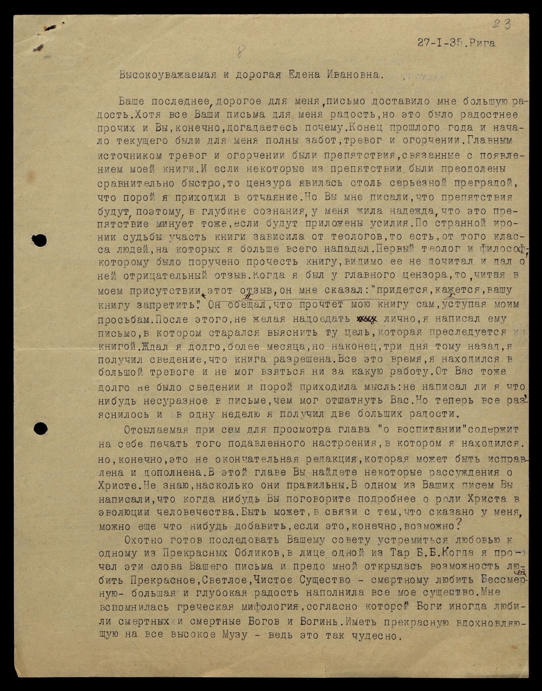 Отсылаемая при сем для просмотра глава "о воспитании" содержит на себе печать того подавленного настроения, в котором я находился. Но, конечно, это не окончательная редакция, которая может быть исправлена и дополнена. В этой главе Вы найдете некоторые рассуждения о Христе. Не знаю, насколько они правильны. В одном из Ваших писем Вы написали, что когда-нибудь Вы поговорите подробнее о роли Христа в эволюции человечества. Быть может в связи с тем, что сказано у меня, можно еще что-нибудь добавить, если это, конечно, возможно?