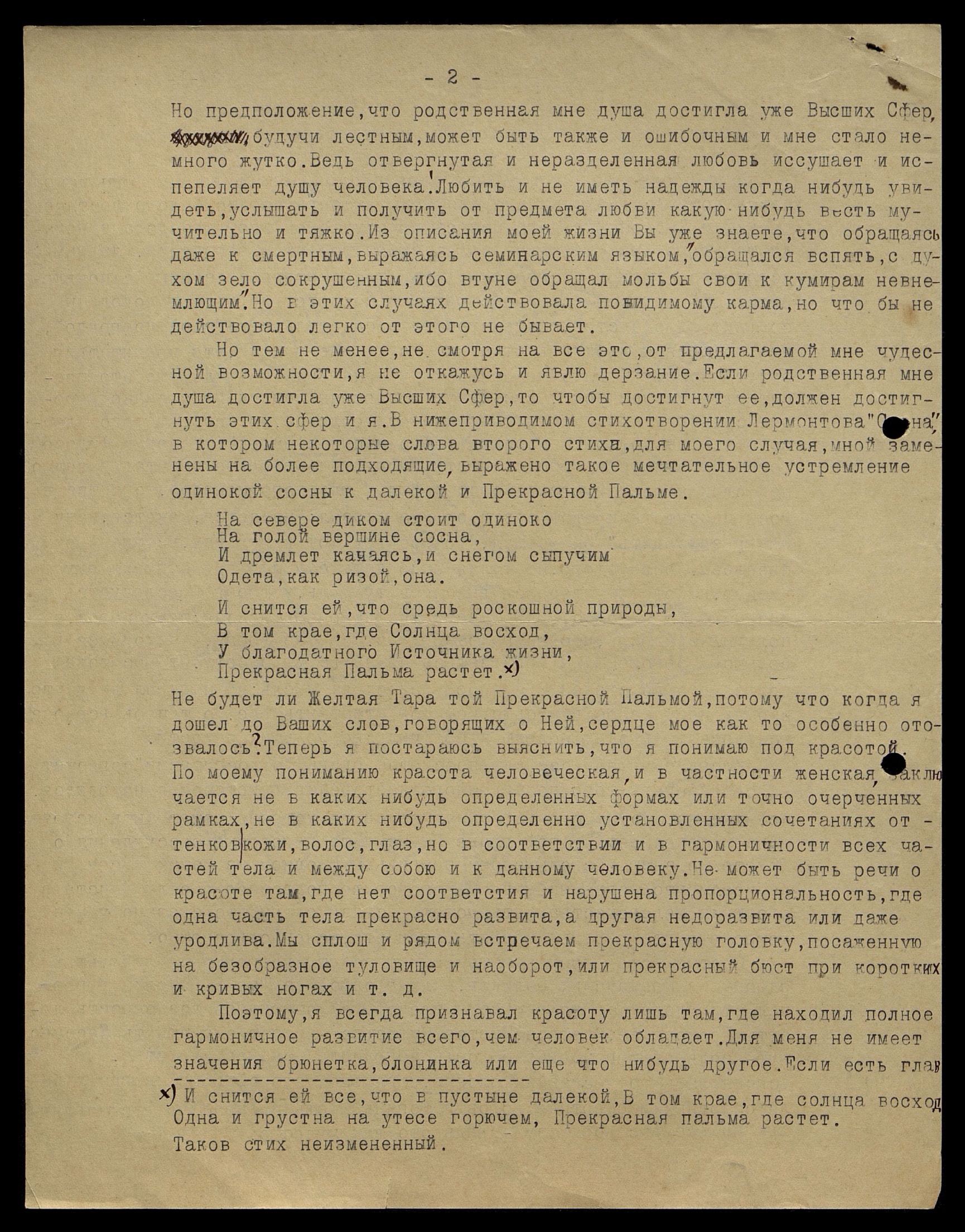 Но тем не менее, не смотря на все это, от предлагаемой мне чудесной возможности я не откажусь и явлю дерзание. Если родственная мне душа достигла уже Высших Сфер, то чтобы достигнуть её, должен достигнуть этих сфер и я. В ниже приводимом стихотворении Лермонтова "Сосна", в котором некоторые слова второго стиха для моего случая мной заменены на более подходящие, выражено такое мечтательное устремление одинокой сосны к далекой и Прекрасной Пальме.