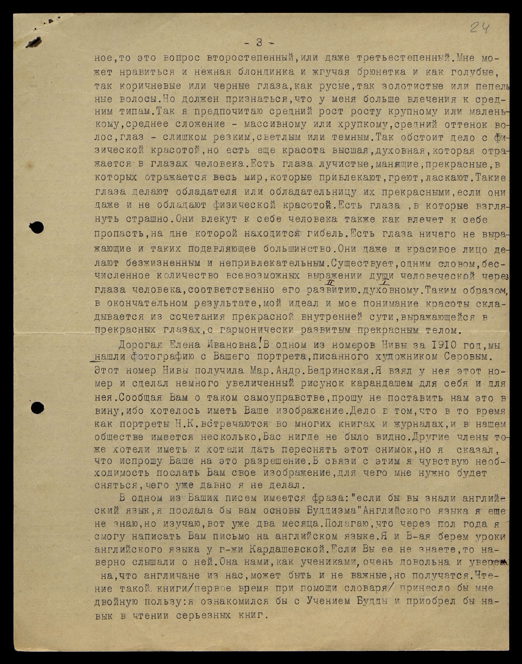 В одном из Ваших писем имеется фраза: "Если бы вы знали английский язык, я послала бы вам основы Буддизма". Английского языка я еще не знаю, но изучаю вот уже два месяца. Полагаю, что через пол года я смогу написать Вам письмо на английском языке. Я и Ведринская берем уроки английского языка у г-жи Кардашевской. Если Вы её не знаете, то наверно слышали о ней. Она нами, как учениками, очень довольна и уверенна, что англичане из нас, может быть и не важные, но получатся. Чтение такой книги (первое время при помощи словаря) принесло бы мне двойную пользу - я ознакомился бы с Учением Будды и приобрел бы навык в чтении серьезных книг.