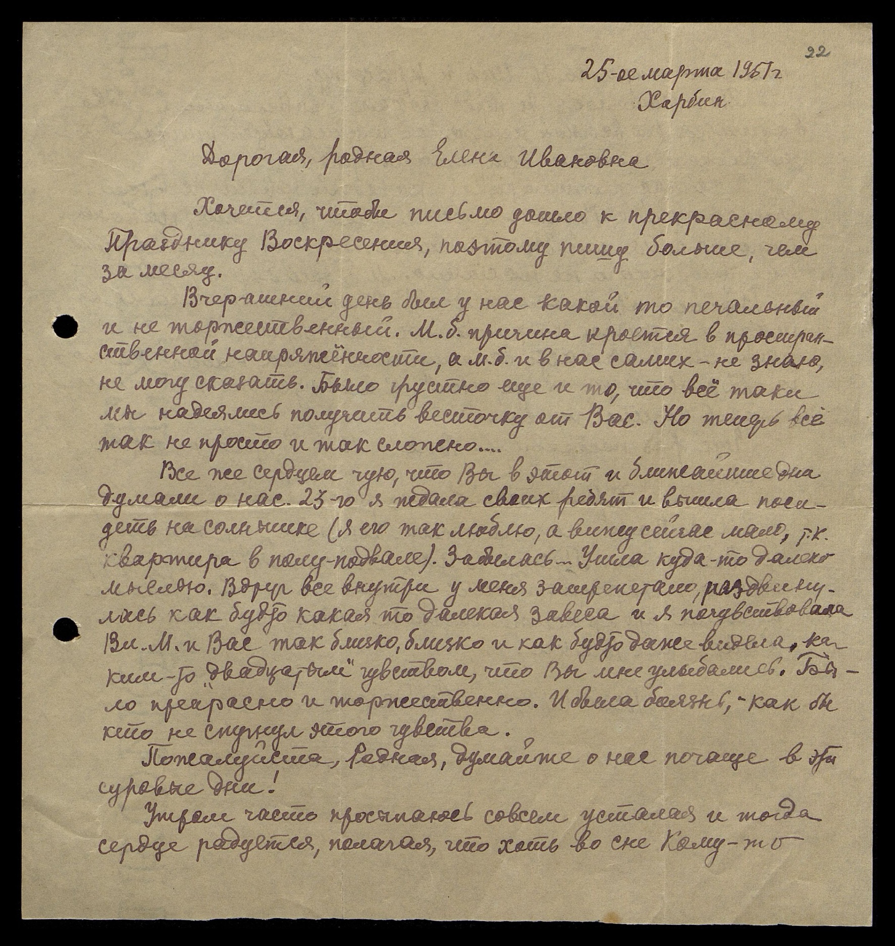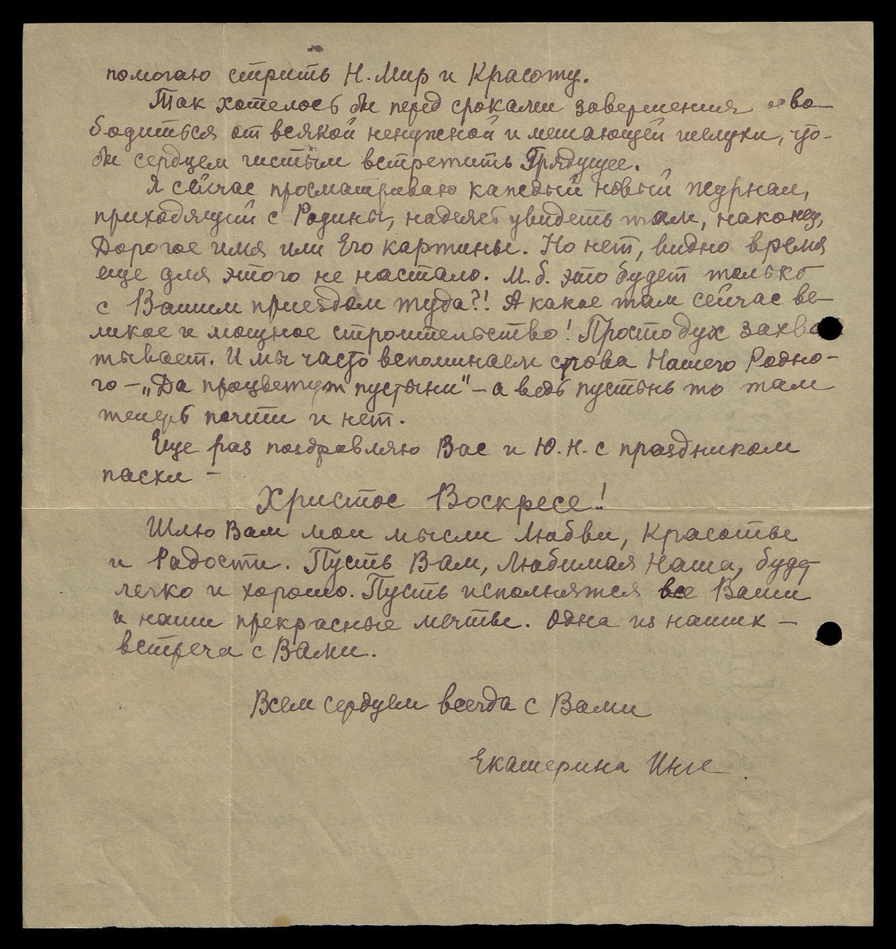 Родная Наша, вот, наконец, и пришло так долгожданное письмо Ваше от 28-го апреля с.г. По-видимому два письма моих с приложениями до Вас не долетели (одно со статьей об Н.К, другое с вырезкой из газеты о метеоре). Спасибо Вам за ласку, за любовь и за поддержку - спасибо сердечное от всех нас. Мы знаем и чувствуем сердцем, как Вам сейчас нелегко и посылаем Вам наши самые светлые мысли и пожелания. Пусть Вам будет радостно и пусть наши думы о Вас долетят к Вам и помогут на Ваших трудных, но таких прекрасных путях. Мы верим также, что Силы Высшие еще надолго охранят Вас - ведь Вы так нужны.