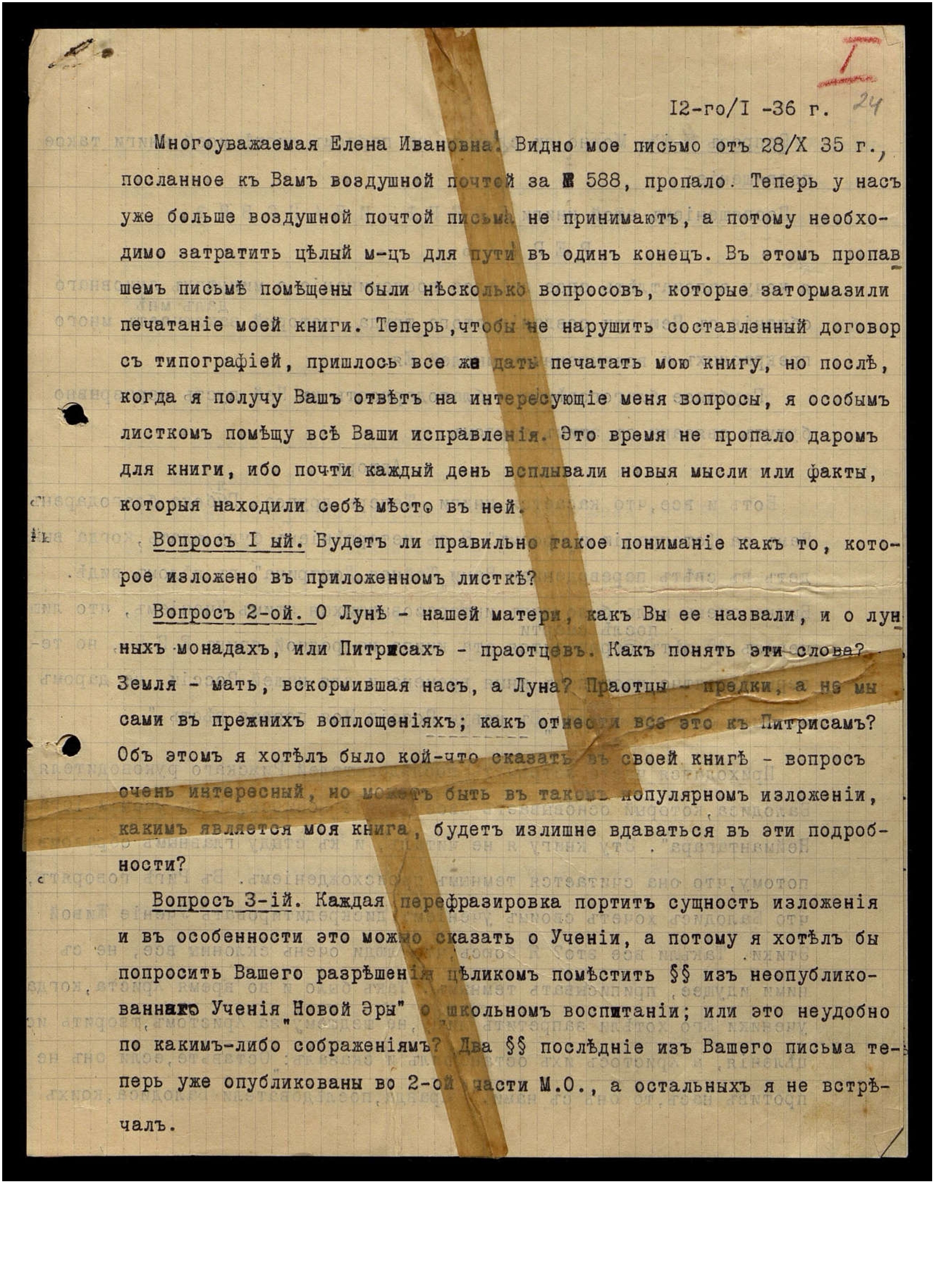 Многоуважаемая Елена Ивановна! Видно мое письмо от 28/Х-1935 г., посланное к Вам воздушной почтой за № 588, пропало. Теперь у нас уже больше воздушной почтой письма не принимают, а потому необходимо затратить целый месяц для пути в один конец. В этом пропавшем письме помещены были несколько вопросов, которые затормозили печатание моей книги. Теперь,чтобы не нарушить составленный договор с типографией, пришлось все же дать печатать мою книгу, но после, когда я получу Ваш ответ на интересующие меня вопросы, я особым листком помещу все Ваши исправления. Это время не пропало даром для книги, ибо почти каждый день всплывали новые мысли или факты, которые находили себе место в ней.
