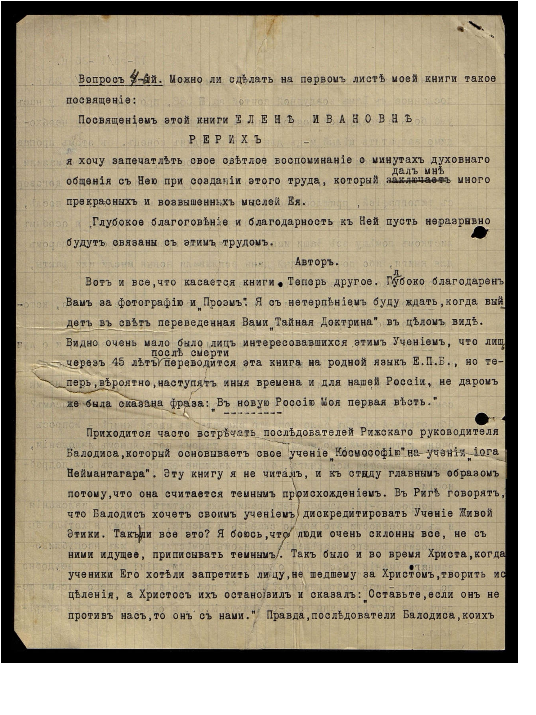 Вот и всё, что касается книги. Теперь другое. Глубоко благодарен Вам за фотографию и "Проэм". Я с нетерпением буду ждать, когда выйдет в свет переведенная Вами "Тайная Доктрина" в целом виде. Видно очень мало было лиц интересовавшихся этим Учением, что лишь через 45 лет после смерти переводится эта книга на родной язык Е.П.Б., но теперь, вероятно, наступят иные времена и для нашей России, не даром же была сказана фраза: "В новую Россию Моя первая весть".