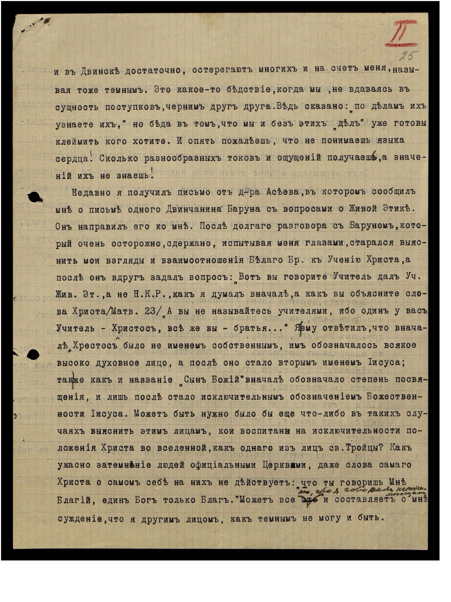 Недавно я получил письмо от д-ра Асеева, в котором сообщил мне о письме одного Двинчанина Баруна с вопросами о Живой Этике. Он направил его ко мне. После долгого разговора с Баруном, который очень осторожно, сдержано, испытывая меня глазами, старался выяснить мои взгляды и взаимоотношения Белого Братства к Учению Христа, а после он вдруг задал вопрос: "Вот вы говорите, Учитель дал Учение Живой Этики, а не Н.К. Рерих, как я думал вначале, а как вы объясните слова Христа (Матв. 23): "А вы не называйтесь учителями, ибо один у вас Учитель - Христос, все же вы - братья..."" Я ему ответил, что вначале "Хрестос" было не именем собственным, им обозначалось всякое высоко духовное лицо, а после оно стало вторым именем Иисуса; так же как и название "Сын Божий" вначале обозначало степень посвящения, и лишь после стало исключительным обозначением Божественности Иисуса. Может быть нужно было бы еще что-либо в таких случаях выяснить этим лицам, которые воспитаны на исключительности положения Христа во вселенной, как одного из лиц св. Тройцы? Как ужасно затемнение людей официальными Церквями, даже слова самого Христа о самом себе на них не действует: "Что ты говоришь Мне Благий, един Бог только Благ". Может все то, что я говорил непонимающим и составляет о мне суждение, что я другим лицом, как темным не могу и быть.