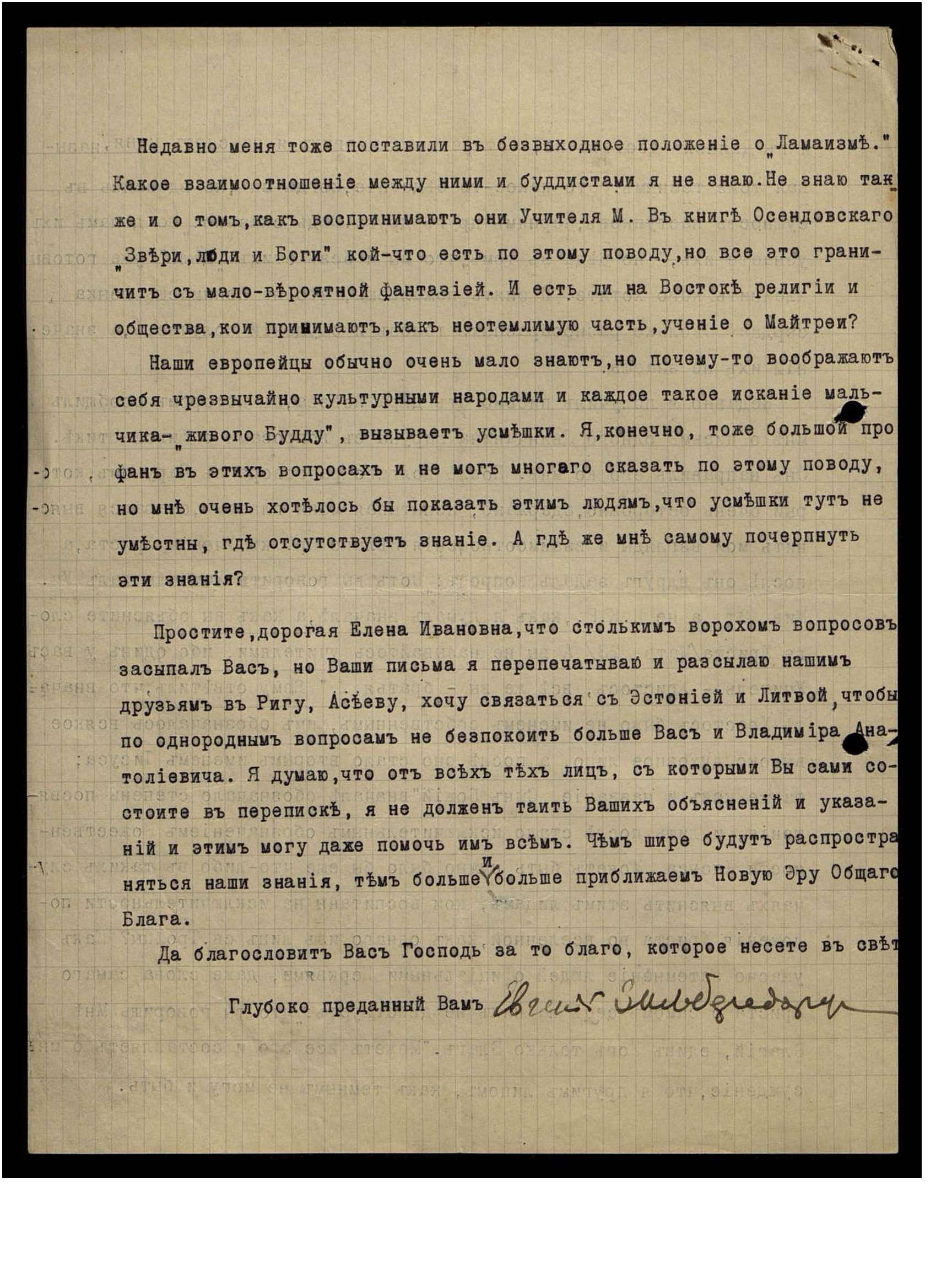Простите, дорогая Елена Ивановна, что стольким ворохом вопросов засыпал Вас, но Ваши письма я перепечатываю и рассылаю нашим друзьям в Ригу, Асееву, хочу связаться с Эстонией и Литвой, чтобы по однородным вопросам не беспокоить больше Вас и Владимира Анатолиевича [Шибаева]. Я думаю, что от всех тех лиц, с которыми Вы сами состоите в переписке, я не должен таить Ваших объяснений и указаний, и этим могу даже помочь им всем. Чем шире будут распространяться наши знания, тем больше и больше приближаем Новую Эру Общего Блага.
