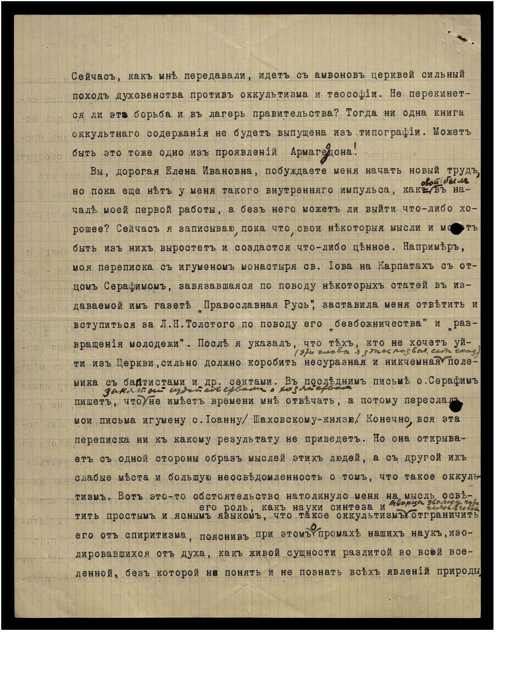 Вы, дорогая Елена Ивановна, побуждаете меня начать новый труд, но пока еще нет у меня такого внутреннего импульса, как свой был в начале моей первой работы, а без него может ли выйти что-либо хорошее? Сейчас я записываю, пока что, свои некоторые мысли и может быть из них вырастет и создастся что-либо ценное. Например, моя переписка с игуменом монастыря св. Иова на Карпатах с отцом Серафимом, завязавшаяся по поводу некоторых статей в издаваемой им газете "Православная Русь", заставила меня ответить и вступиться за Л.Н. Толстого по поводу его "безбожничества" и "развращения молодежи". После я указал, что тех, кто не хочет уйти из Церкви, сильно должно коробить несуразная и никчемная (эти слова я здесь позволил себе сказать) полемика с баптистами и др. сектами. В последнем письме о. Серафим пишет, что занятый издательством и хозяйством не имеет времени мне отвечать, а потому переслал мои письма игумену о. Иоанну (Шаховскому - князю). Конечно, вся эта переписка ни к какому результату не приведет. Но она открывает с одной стороны образ мыслей этих людей, а с другой их слабые места и большую неосведомленность о том, что такое оккультизм. Вот это-то обстоятельство натолкнуло меня на мысль, осветить простым и ясным языком, что такое оккультизм, его роль, как науки синтеза и творца эволюционного пути человечества отграничить его от спиритизма, пояснив при этом о промахе наших наук, изолировавшихся от духа, как живой сущности разлитой во всей вселенной, без которой не понять и не познать всех явлений природы.